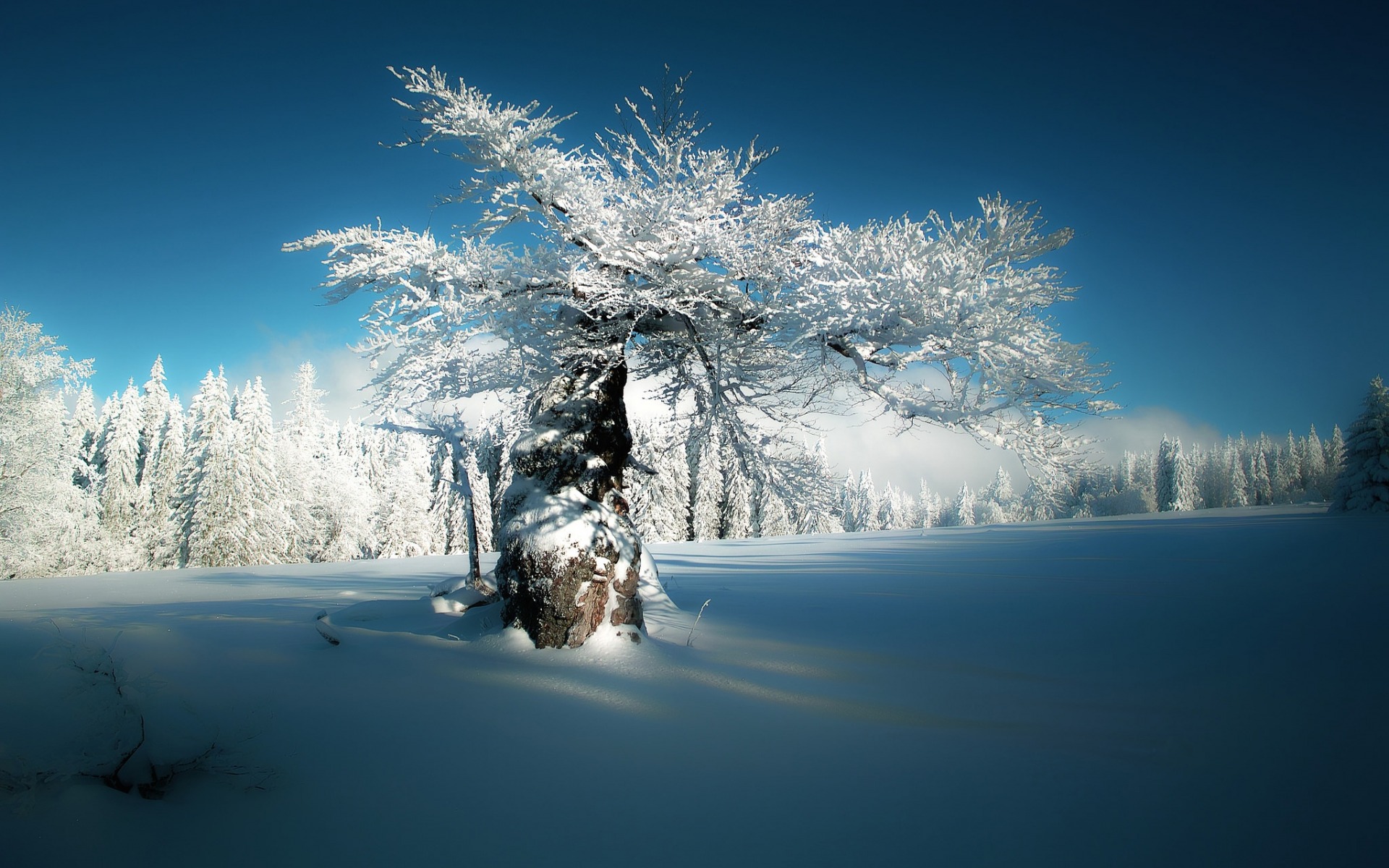Description: A snow covered tree in a snowy field with trees in the background and a blue sky above it.