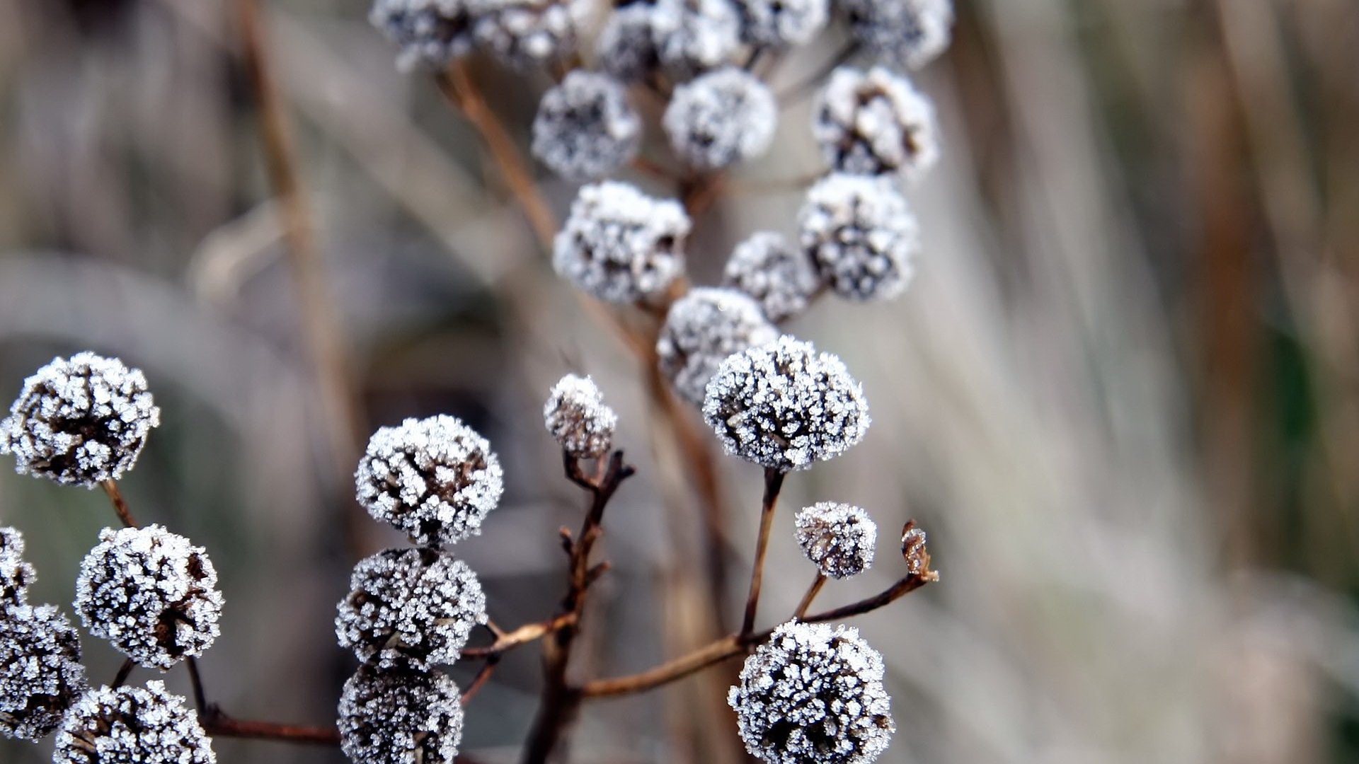 Description: A close up of a plant with snow on it's leaves and stems in the background.