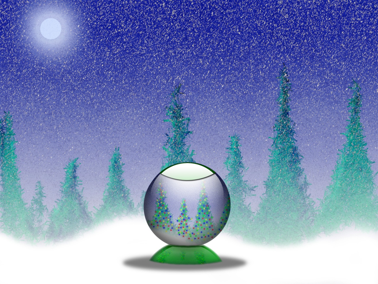 Description: A snow globe sitting on top of a green base in the snow with trees in the background and a bright blue sky.