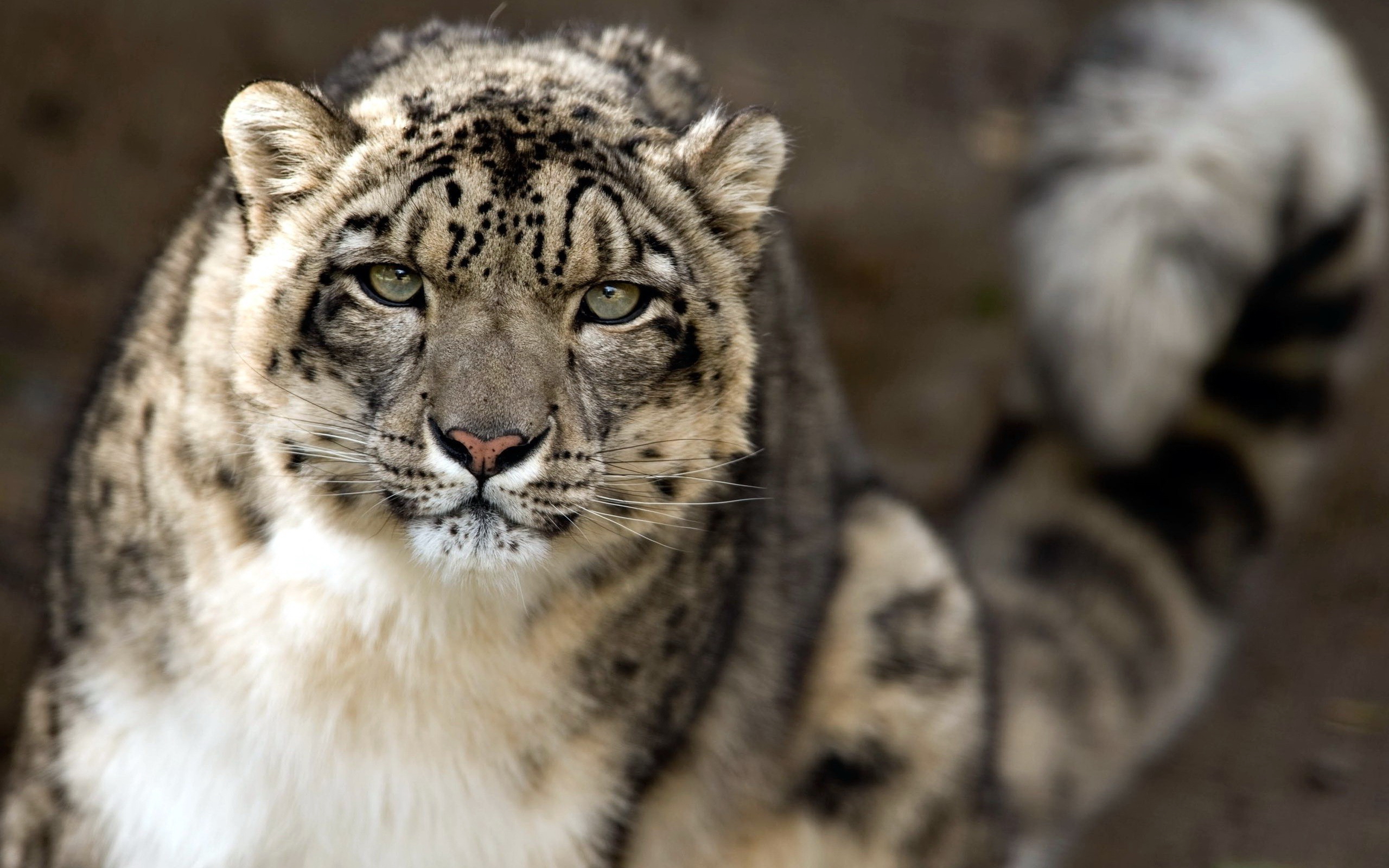 Description: A close up of a snow leopard looking at the camera with a blurry background of dirt and grass.