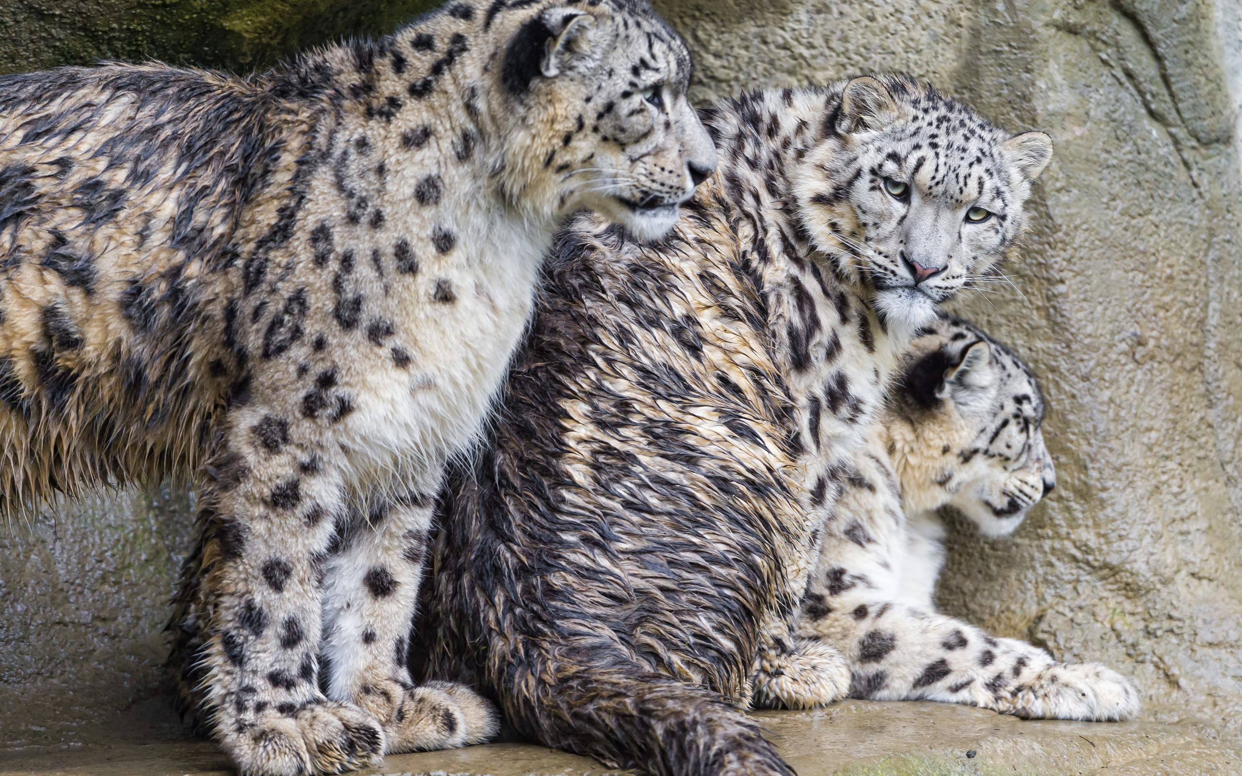 Description: A group of snow leopards sitting next to each other on a rock wall in a zoo enclosure at the zoo.