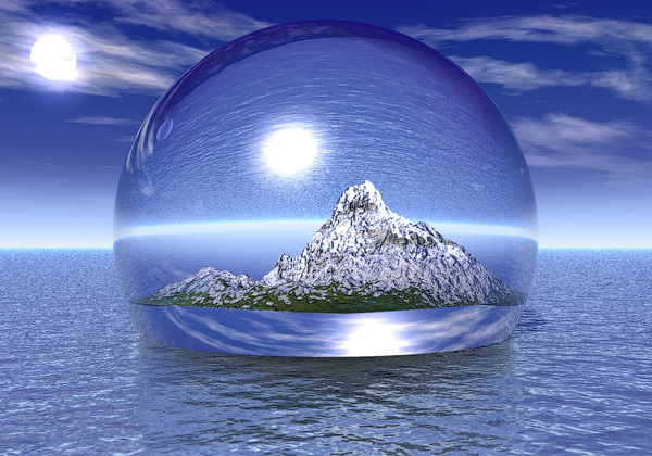Description: A snow covered mountain in a glass ball on the water with a moon in the sky above it and a full moon in the sky above.