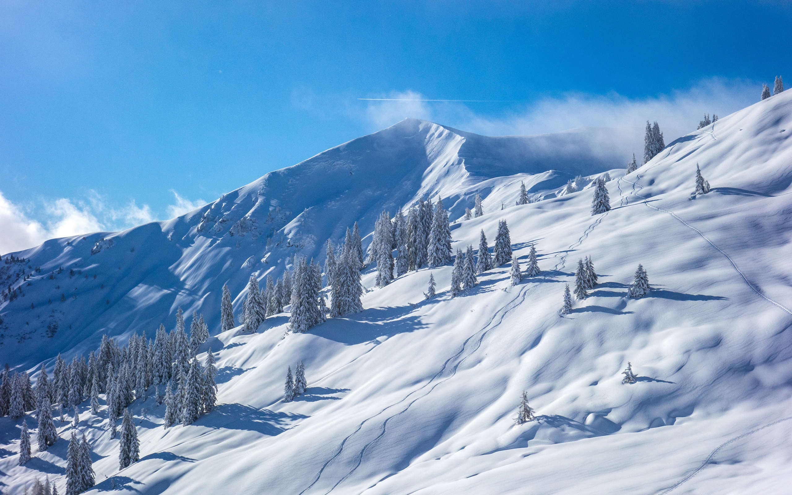 Description: A snow covered mountain with a ski lift going up it's side and trees on the side of it.
