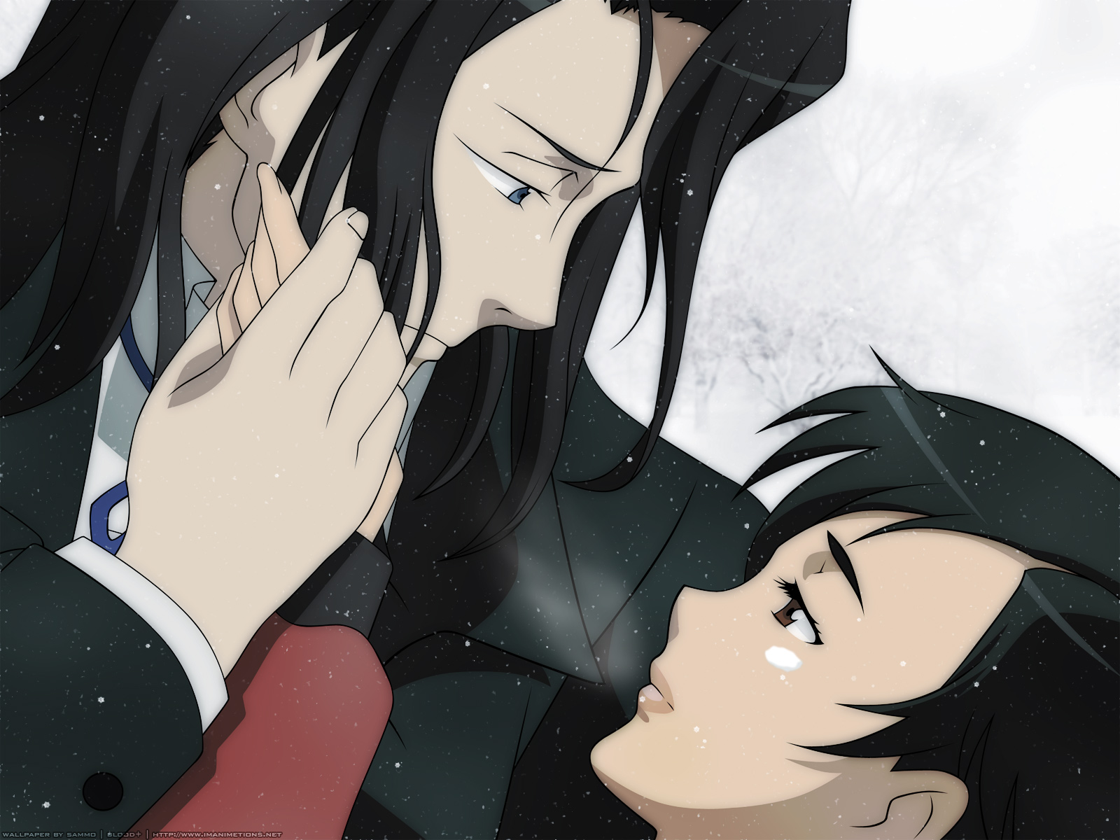 Description: A man and a woman are touching noses in the snow with snow falling on them and trees in the background.