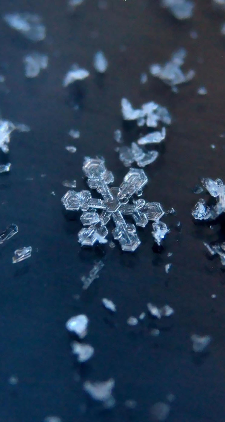 Description: A snowflake is shown on a black surface with water droplets on it and a snowflake is seen in the foreground.