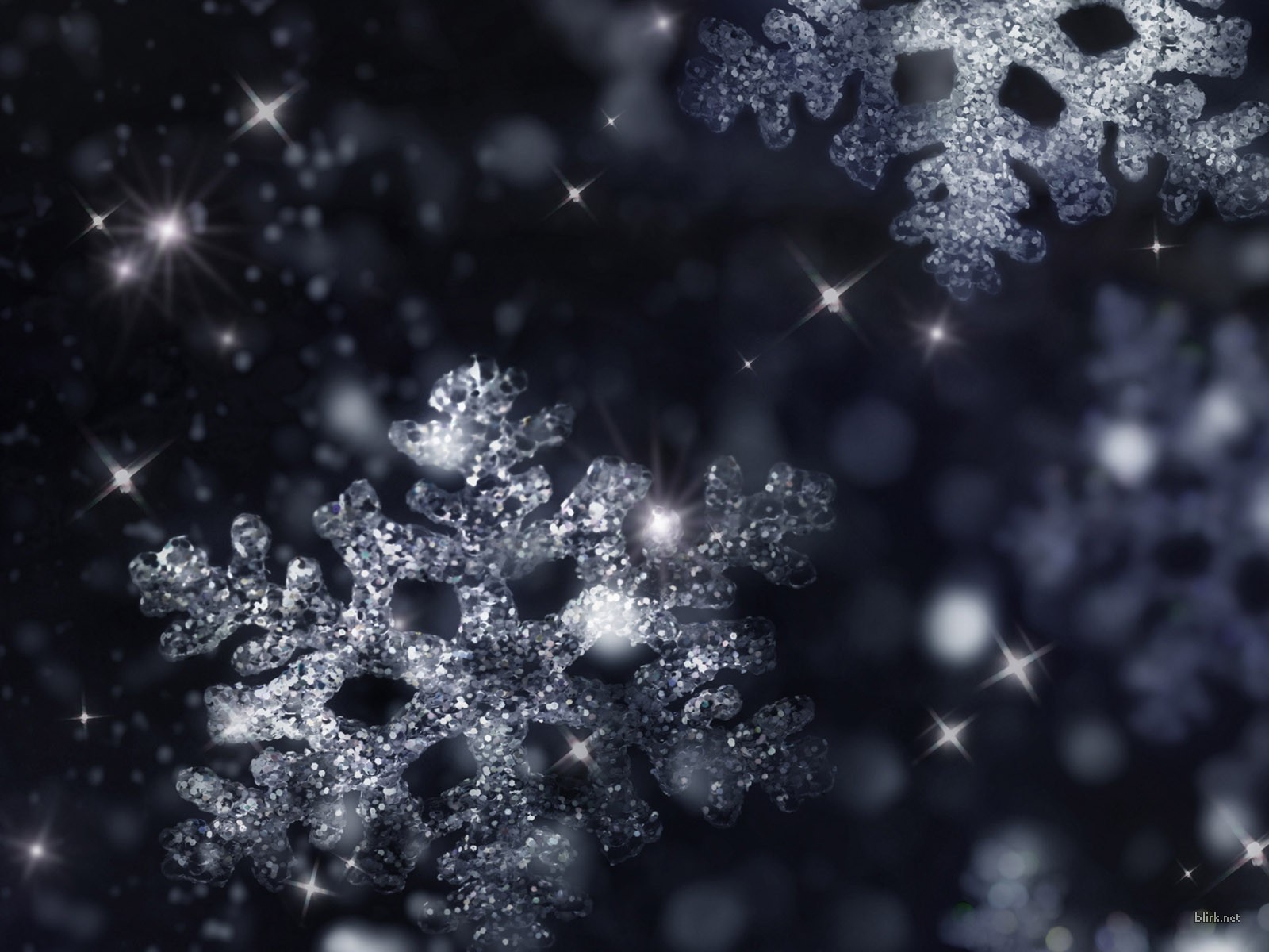 Description: A snowflake is shown in the dark with stars on it and snow flakes are scattered around.