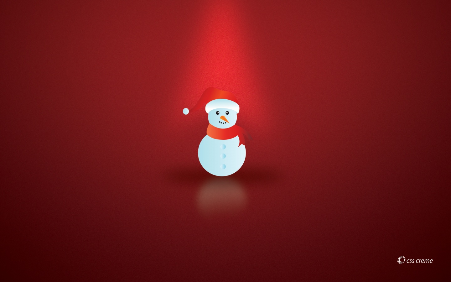 Description: A white snowman with a red hat and scarf on a red background with a spotlight from the ceiling.