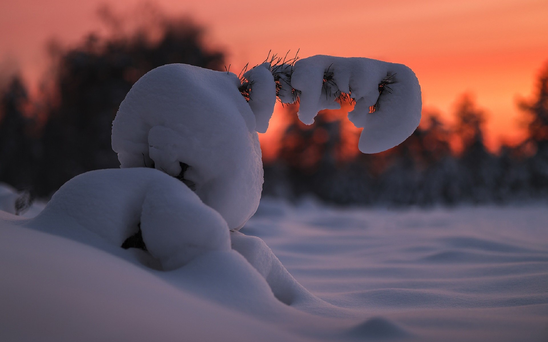 Description: A snow covered animal with its nose open in the snow at sunset or dawn with trees in the background.