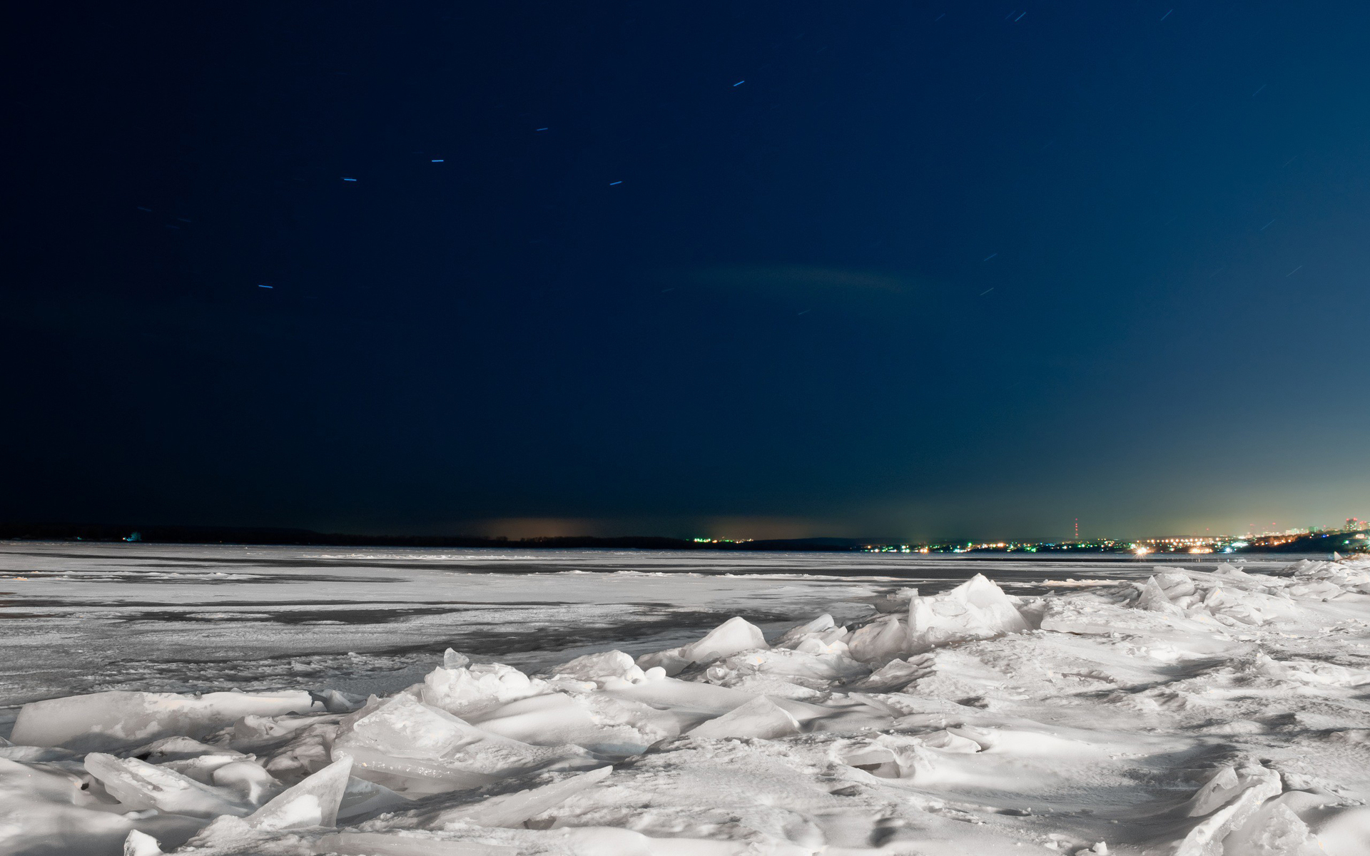 Description: A person walking on a snowy beach at night with a city in the background and a bright light in the distance.