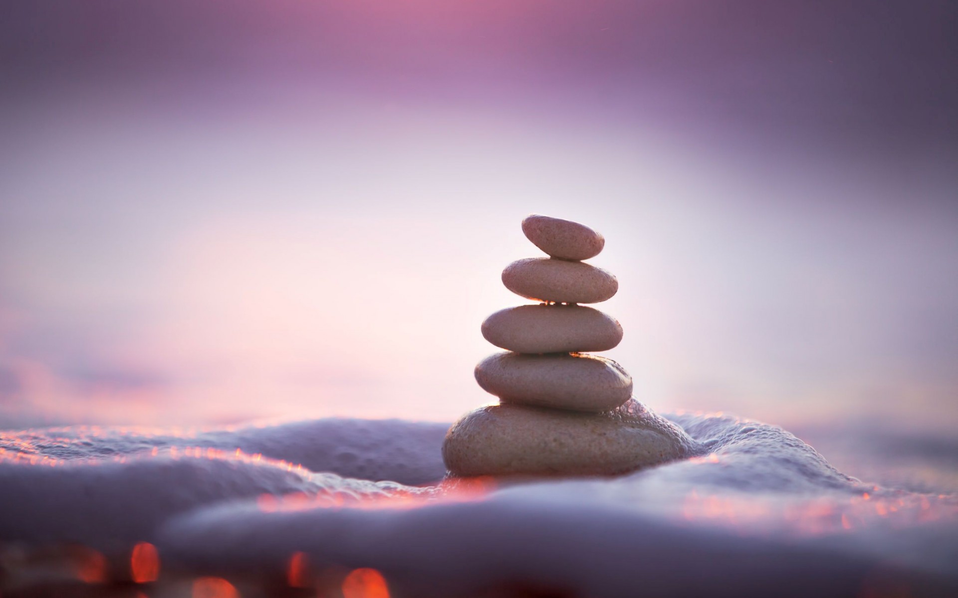 Description: A stack of rocks sitting on top of a beach covered in snow at sunset with a bright light in the background.