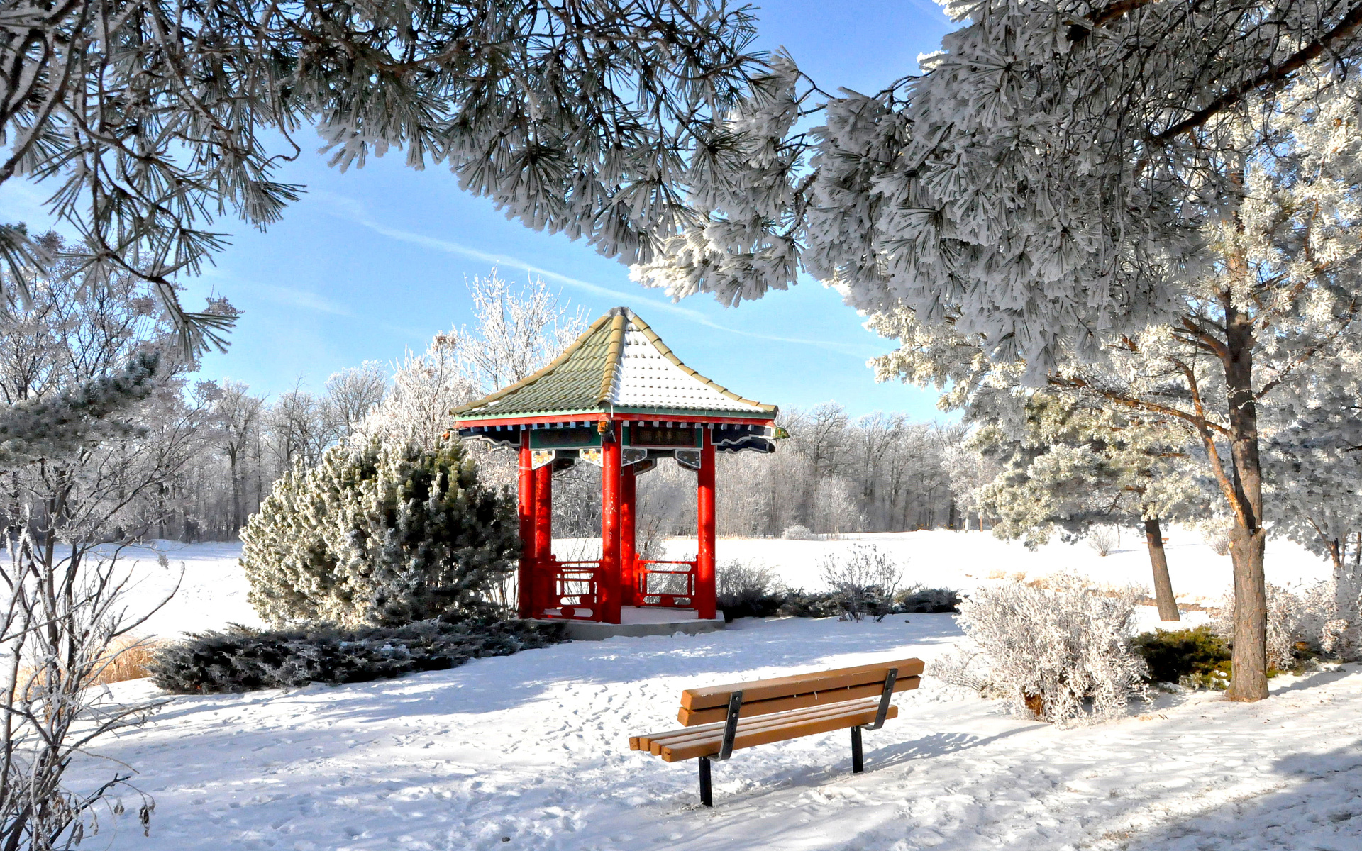 Description: A bench in the snow under a tree with a gazebo in the background and snow on the ground.