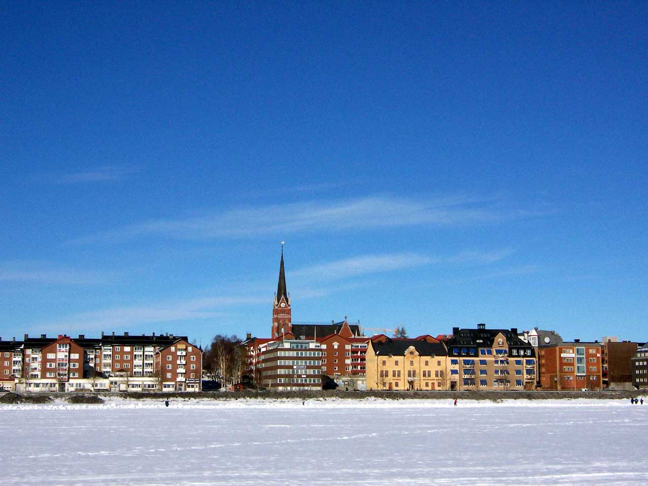 Description: A large building with a clock tower in the middle of a snowy field with buildings in the background and a blue sky.