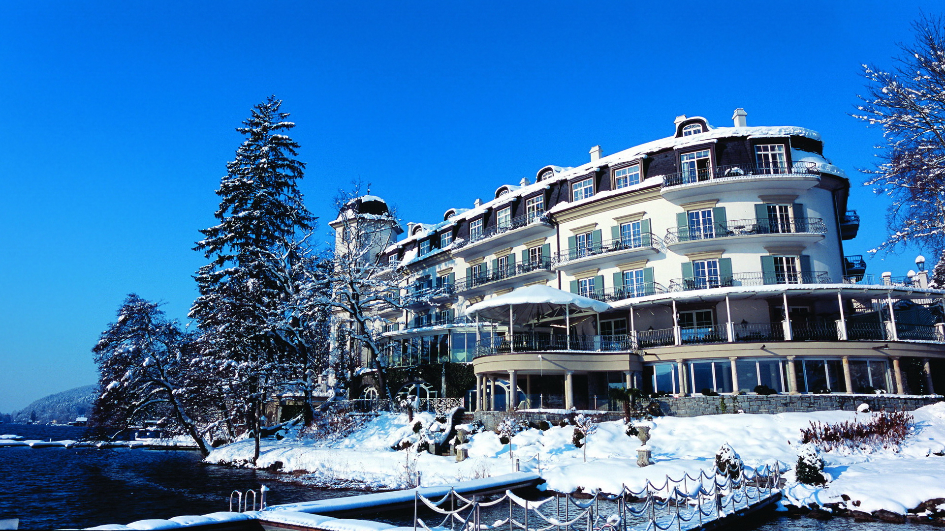 Description: A large building with a snow covered roof next to a body of water and trees covered in snow with a dock in front of it.