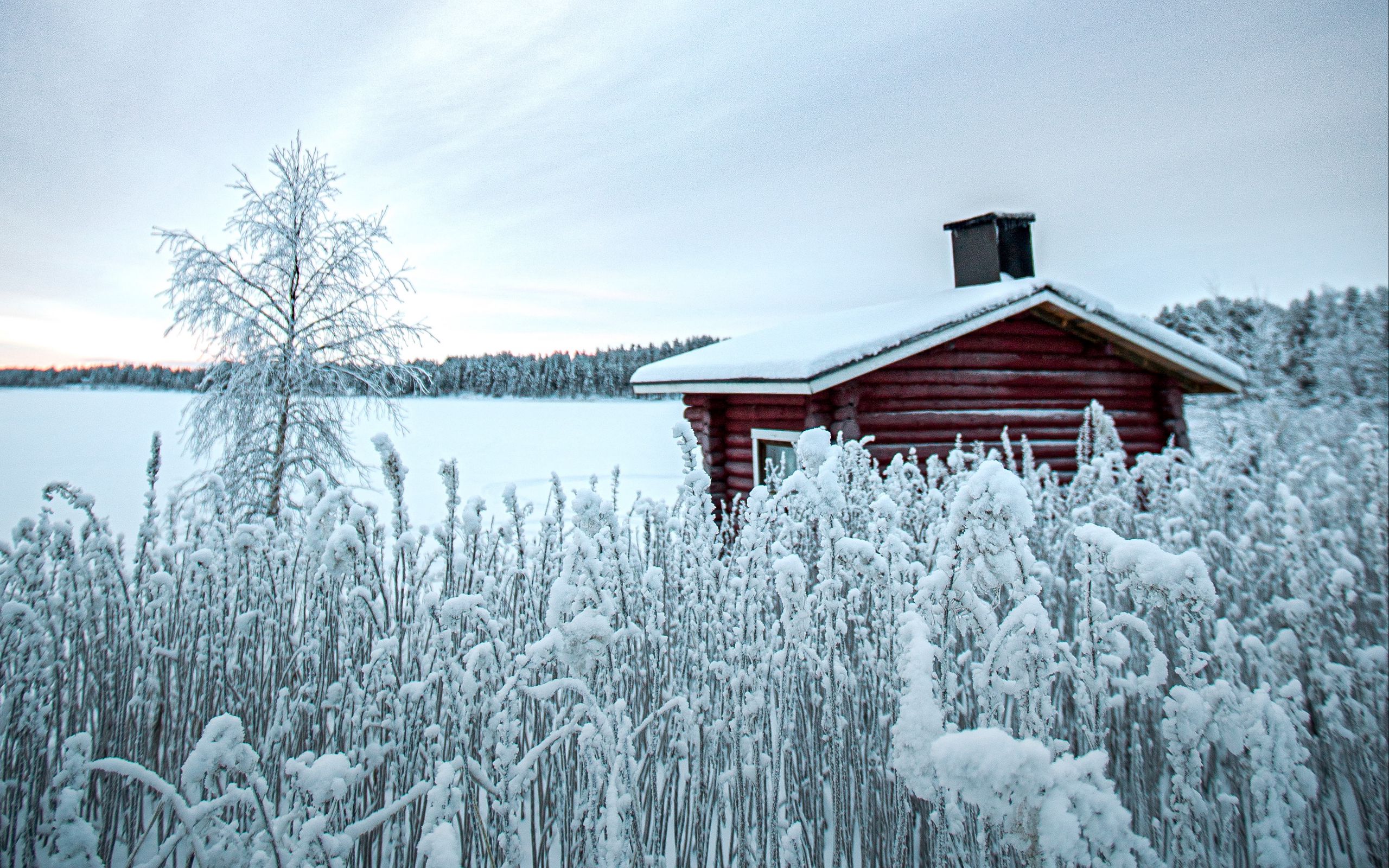 Description: A cabin in the middle of a field of snow covered grass and trees with a lake in the background.
