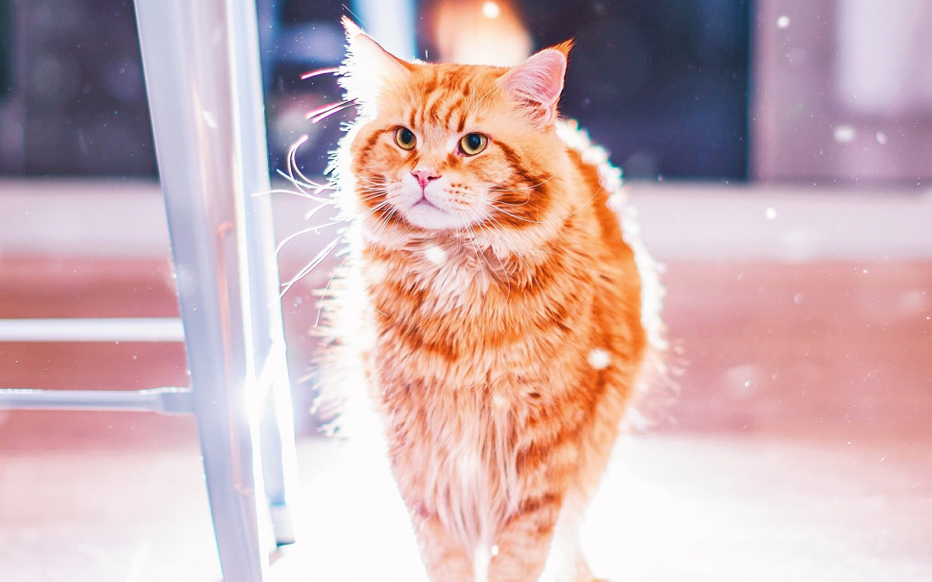 Description: A cat walking on a sidewalk in the snow near a metal pole and a door with a light shining on it.