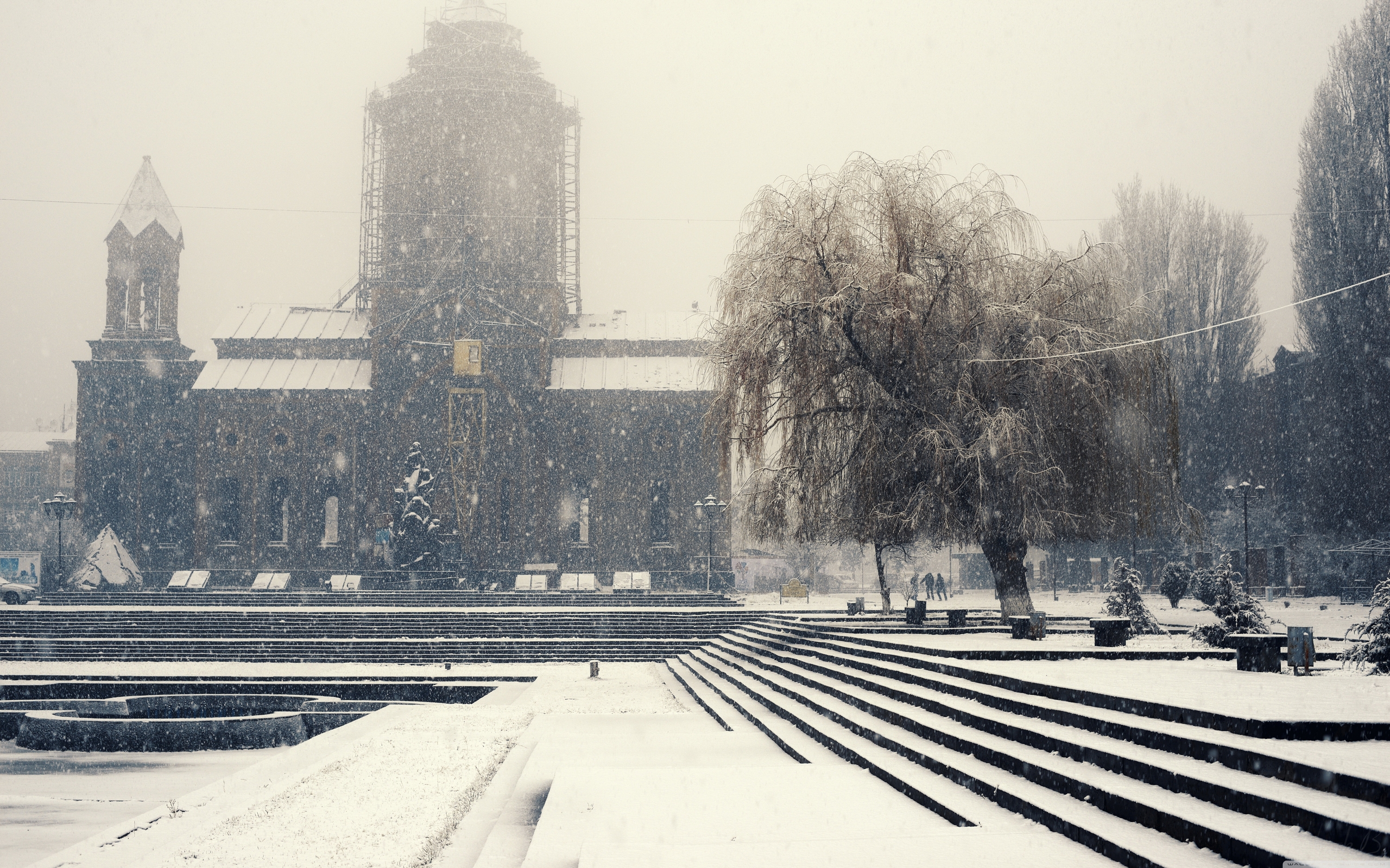 Description: A snowy day with a church and steps in the foreground and a tree in the background with snow falling on the ground.