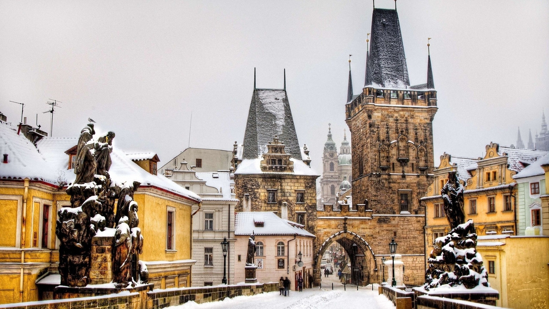 Description: A snowy day in a european city with a church and a clock tower in the background and a statue of a man on a bench.