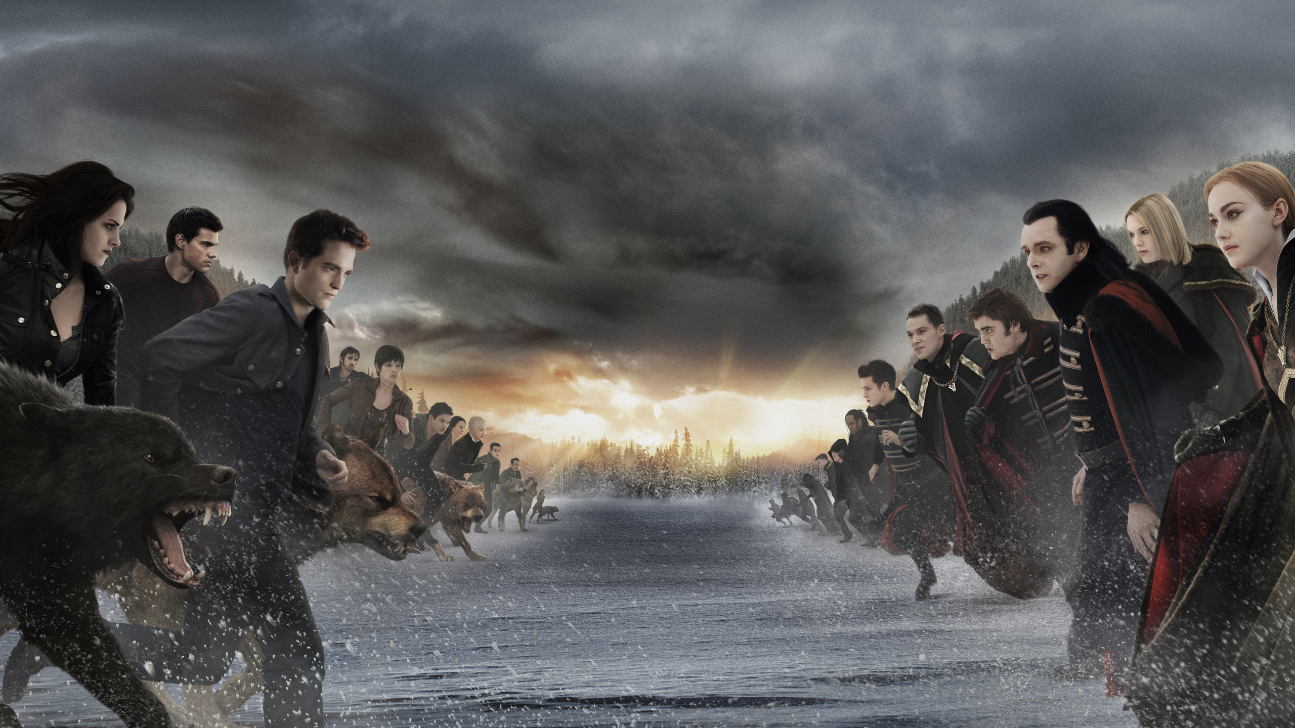 Description: A group of people walking across a snow covered field next to a wolf and a man in a suit.