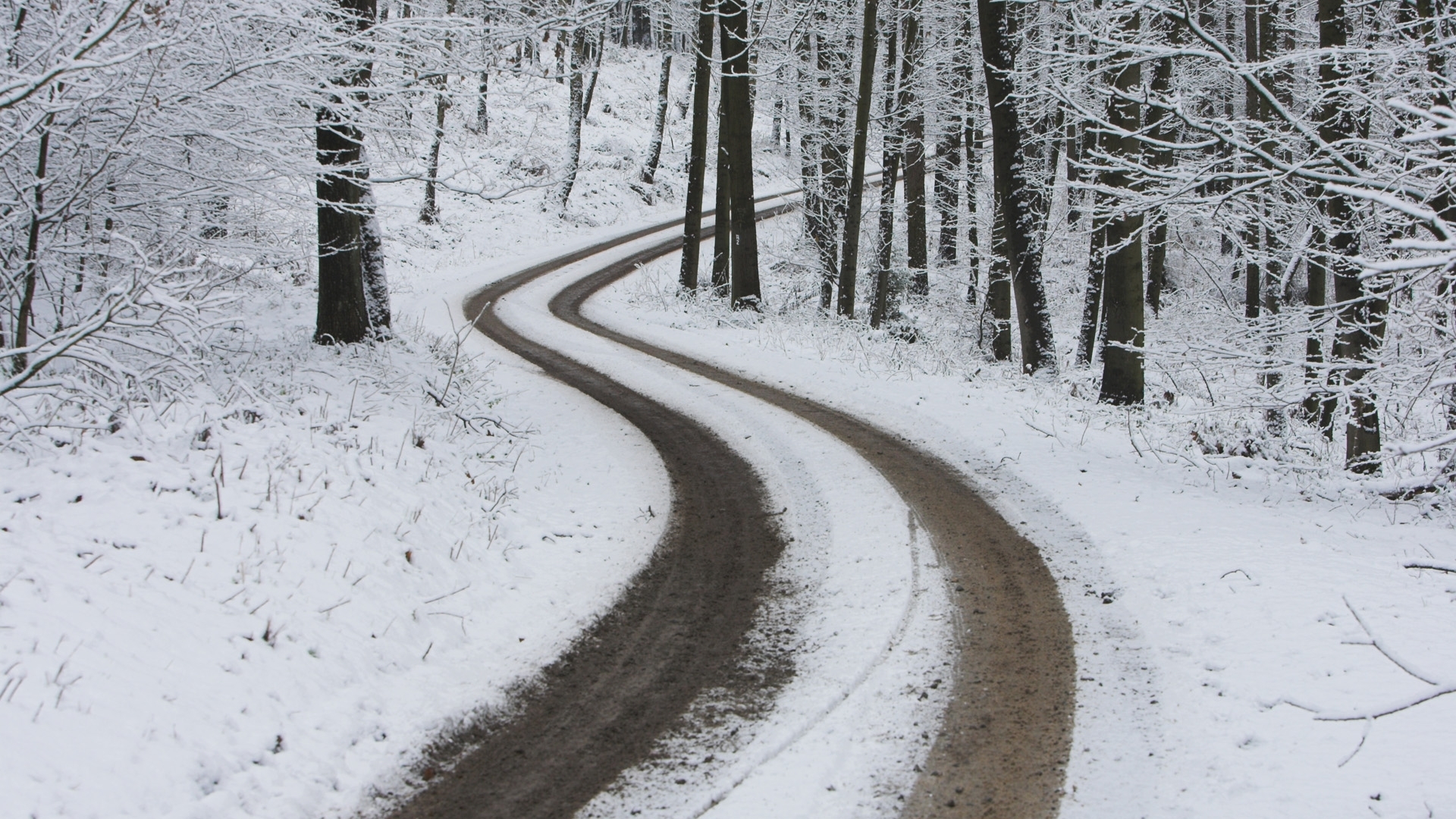 Description: A road in the middle of a snowy forest with trees on both sides of it and a curved road on the other side.
