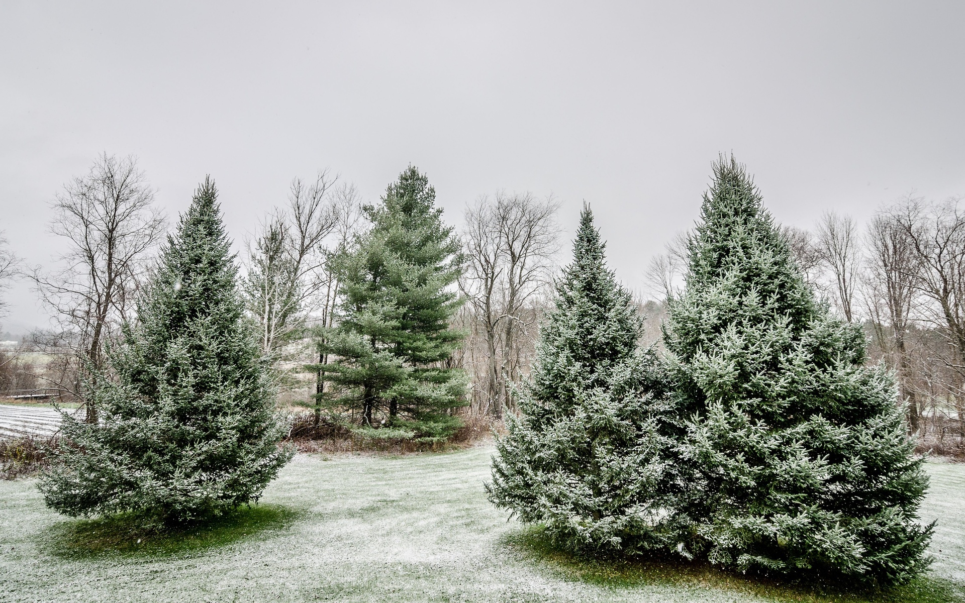 Description: A group of trees in a field covered in snow and ice with a fence in the background and a snow covered field in the foreground.