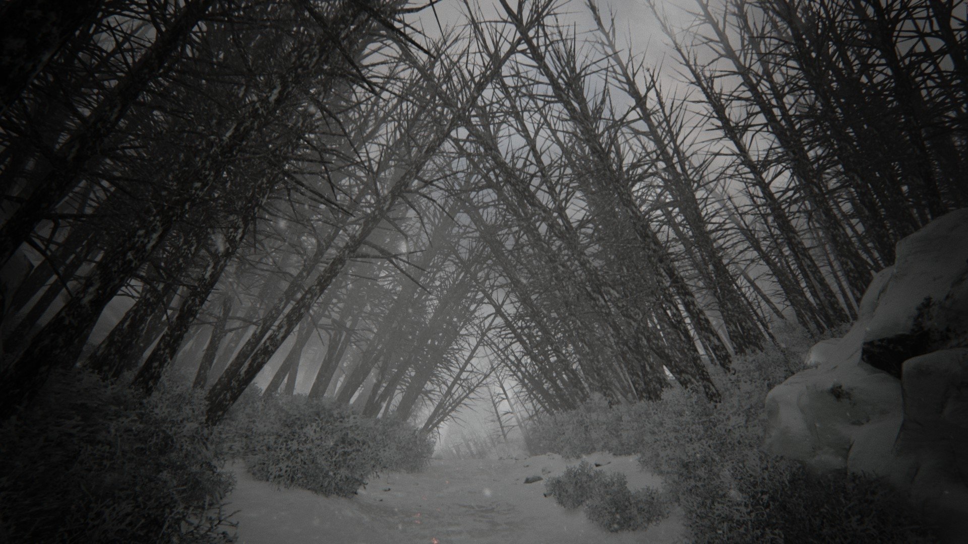 Description: A path through a forest covered in snow with trees in the background and a person walking on the path.