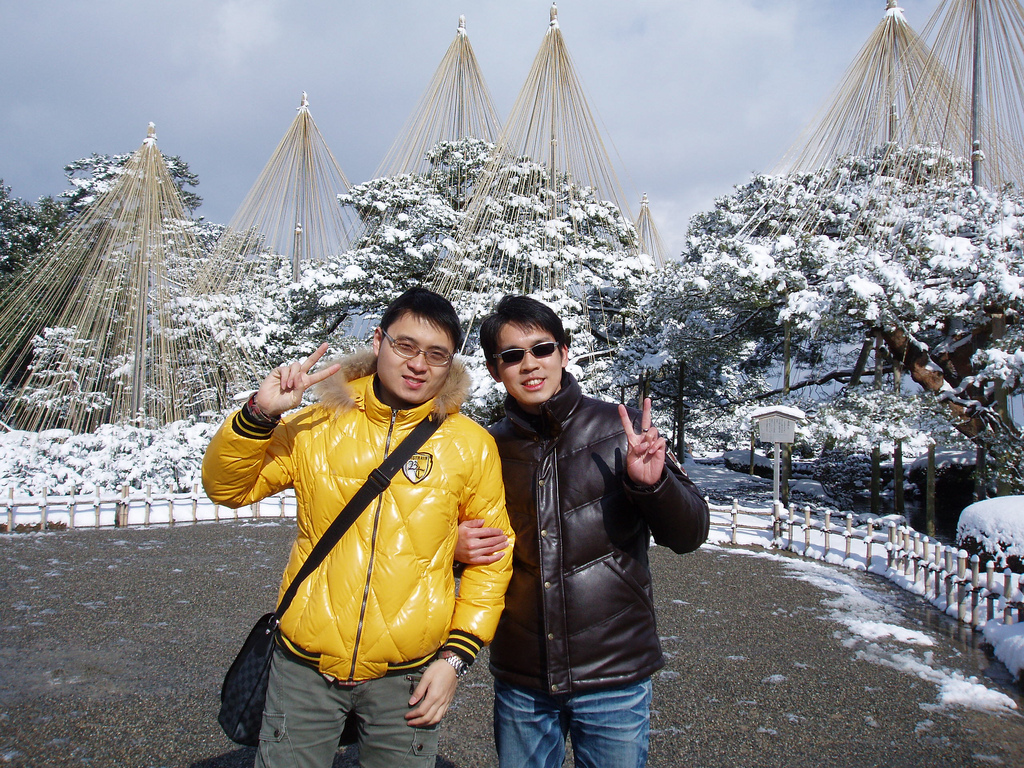 Description: Two people standing in front of a snow covered forest with trees in the background and one person giving the peace sign.