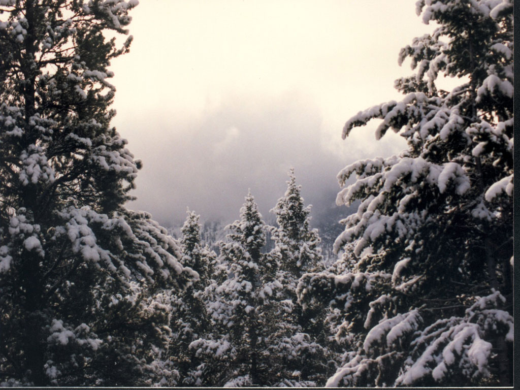 Description: A snow covered forest with a sky background and clouds in the distance with a few trees in the foreground.