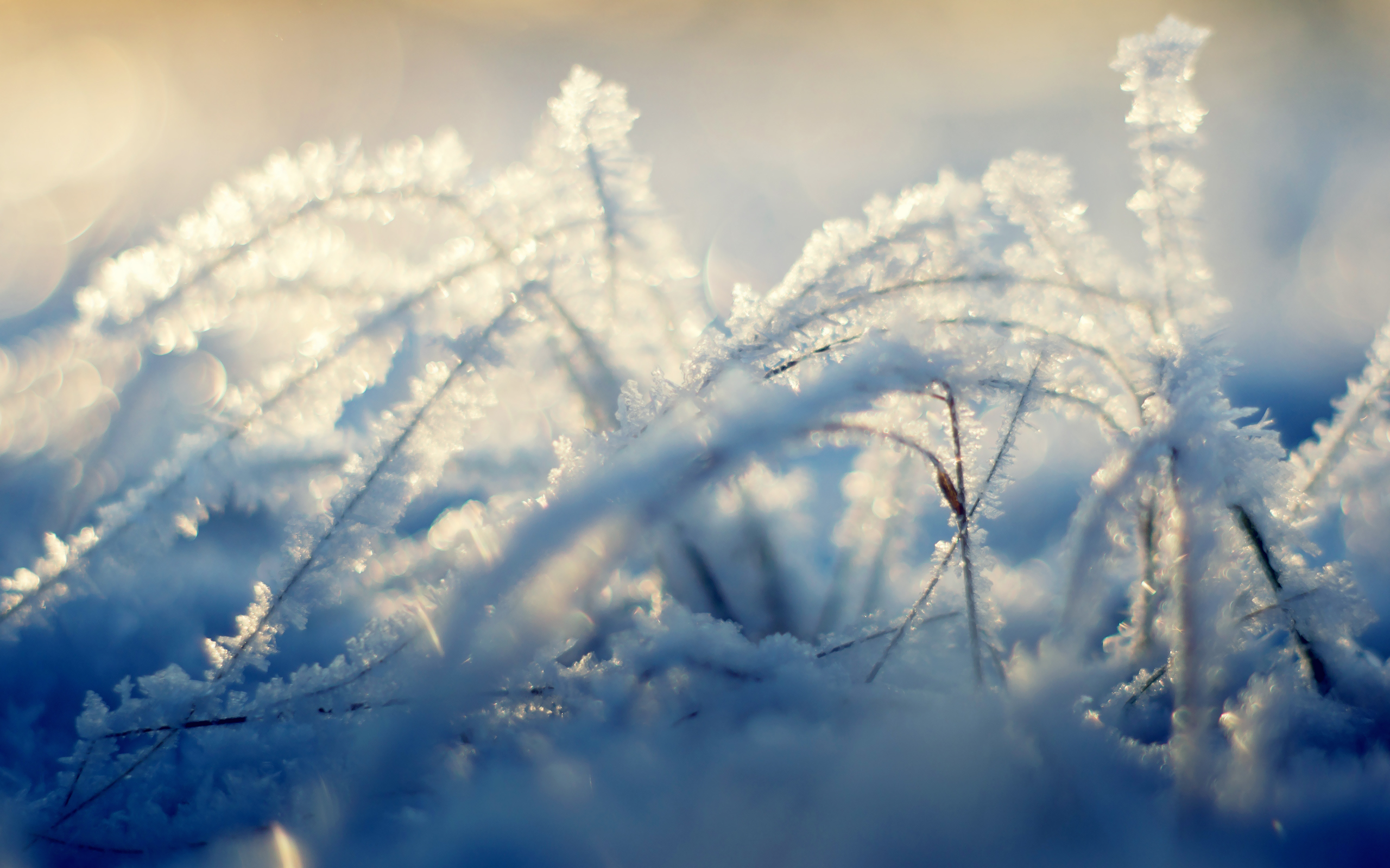 Description: A close up of a bunch of grass covered in snow and ice crystals and grass blades are in the foreground.