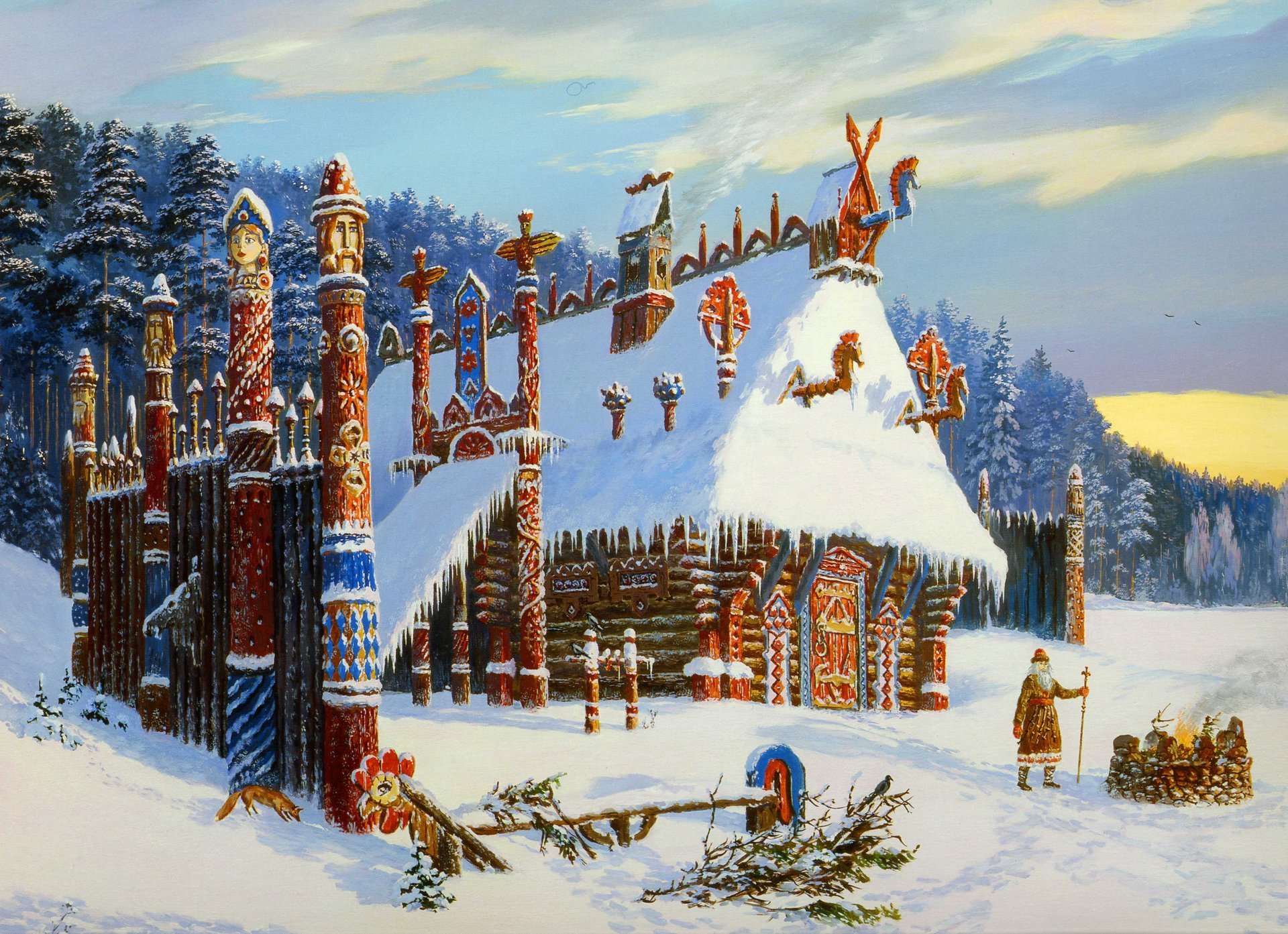 Description: A painting of a snowy landscape with a building and people in the snow and a sky background with clouds.