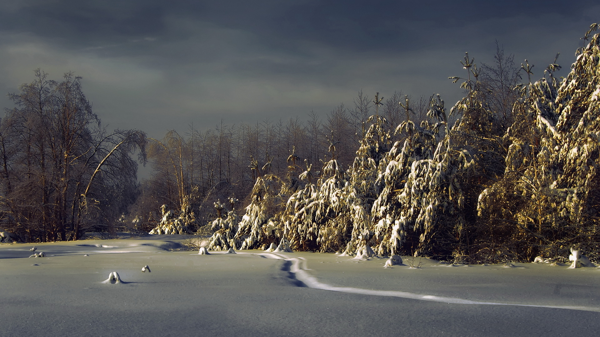 Description: A snowy landscape with trees and a path in the snow with snow on the ground and a dark sky.