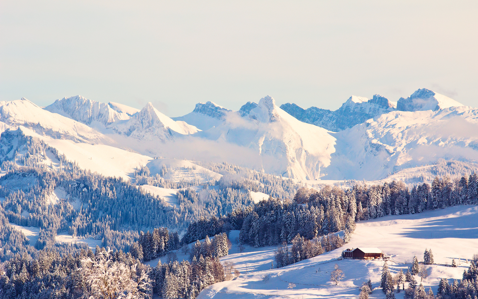 Description: A snowy mountain range with a cabin in the foreground and a few trees in the foreground.