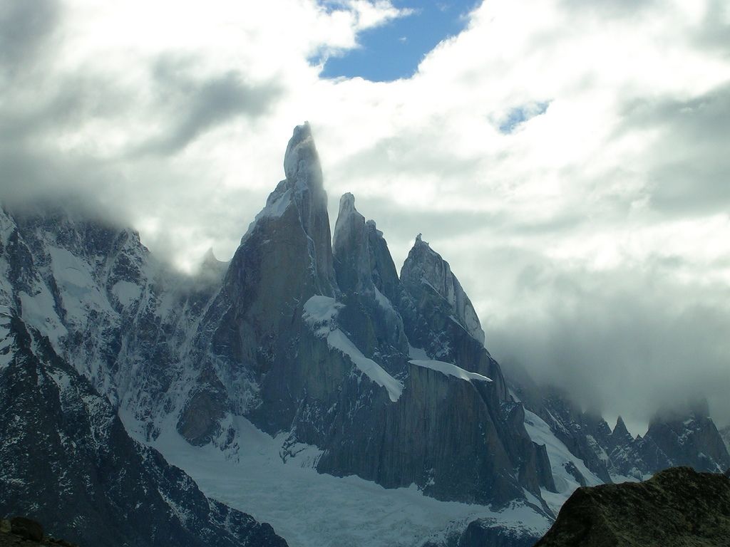 Description: A mountain with snow on it and clouds in the sky above it and a few rocks below it and a few snow on the ground.