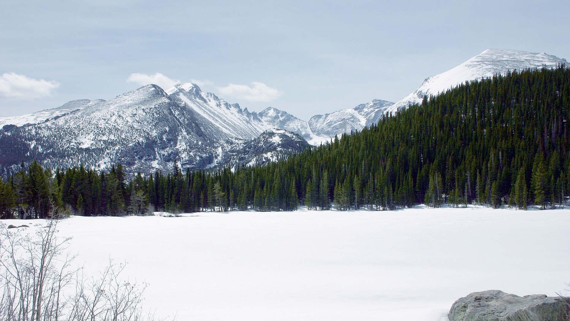 Description: A snowy field with a mountain in the background and trees in the foreground with a few snow on the ground.