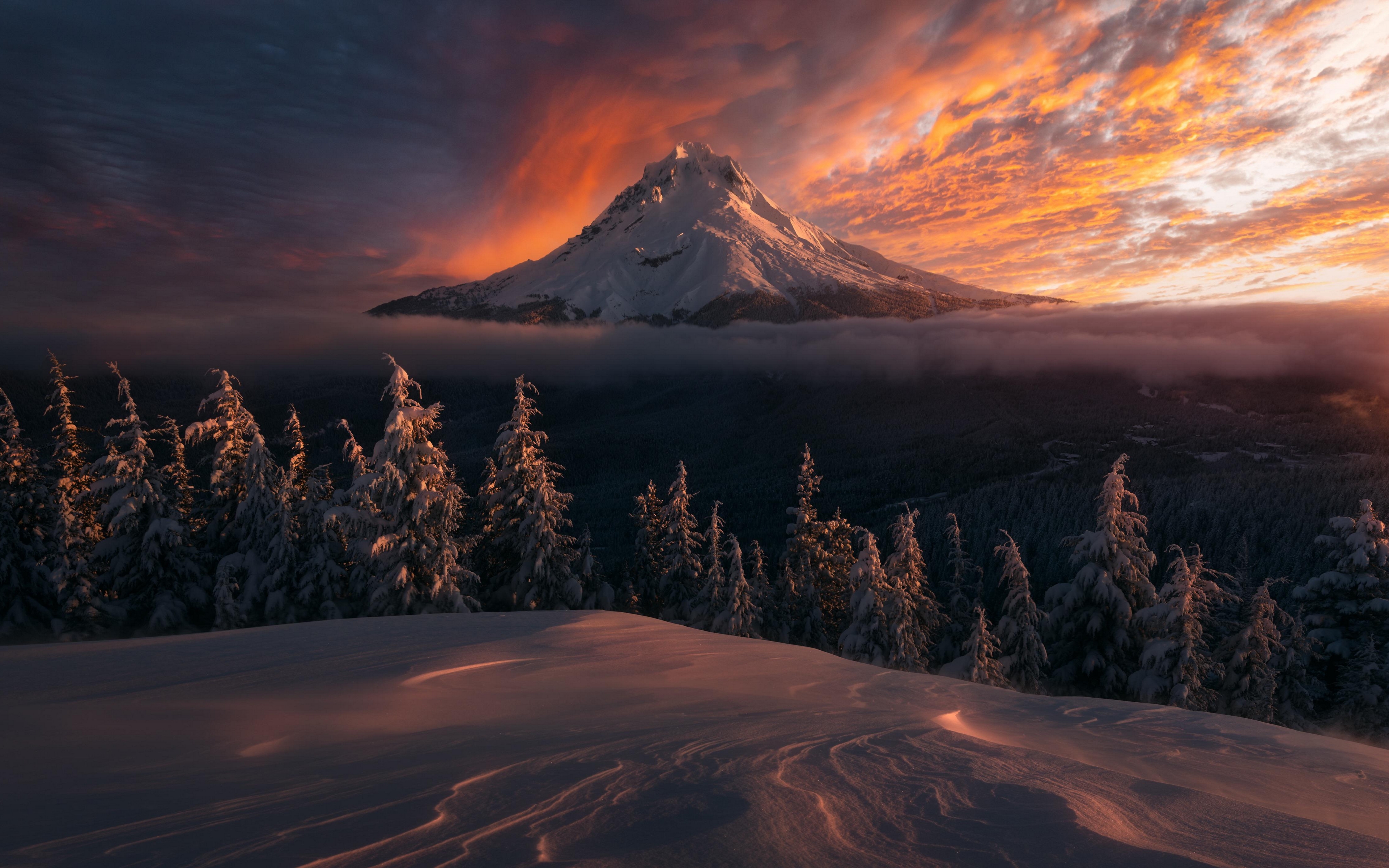 Description: A mountain covered in snow under a cloudy sky with trees in the foreground and a sunset in the background.