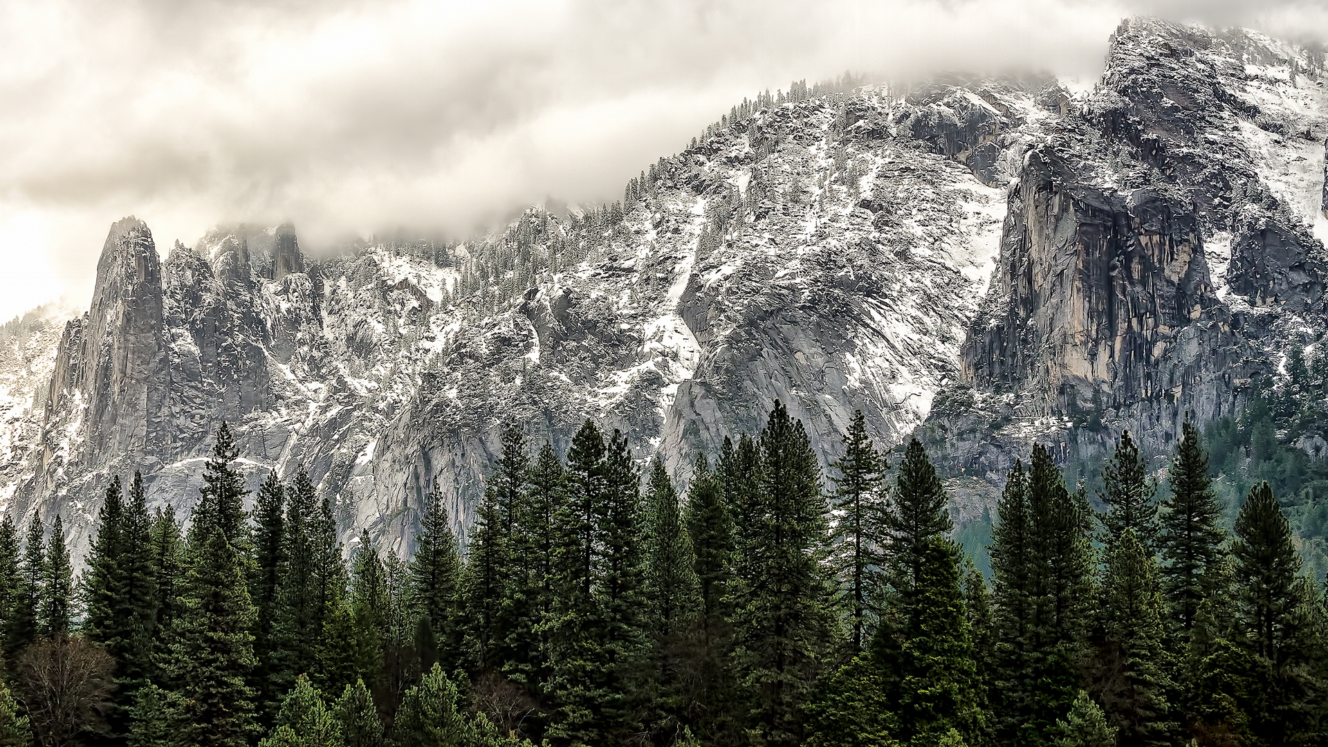 Description: A mountain covered in snow and surrounded by trees and clouds in the distance is a forest with tall pine trees.