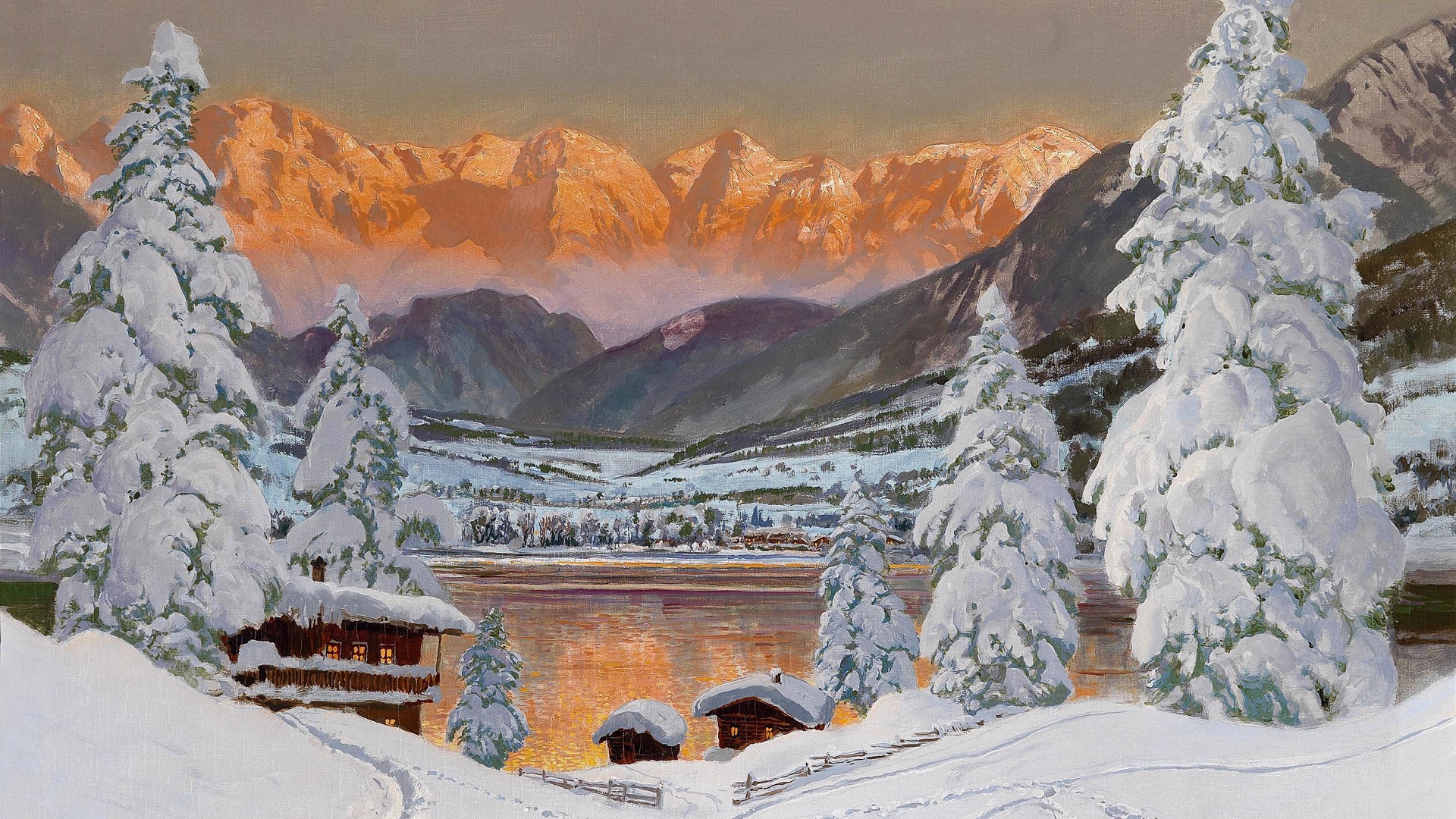 Description: A painting of a snowy mountain scene with a lake and trees in the foreground and a sunset in the background.