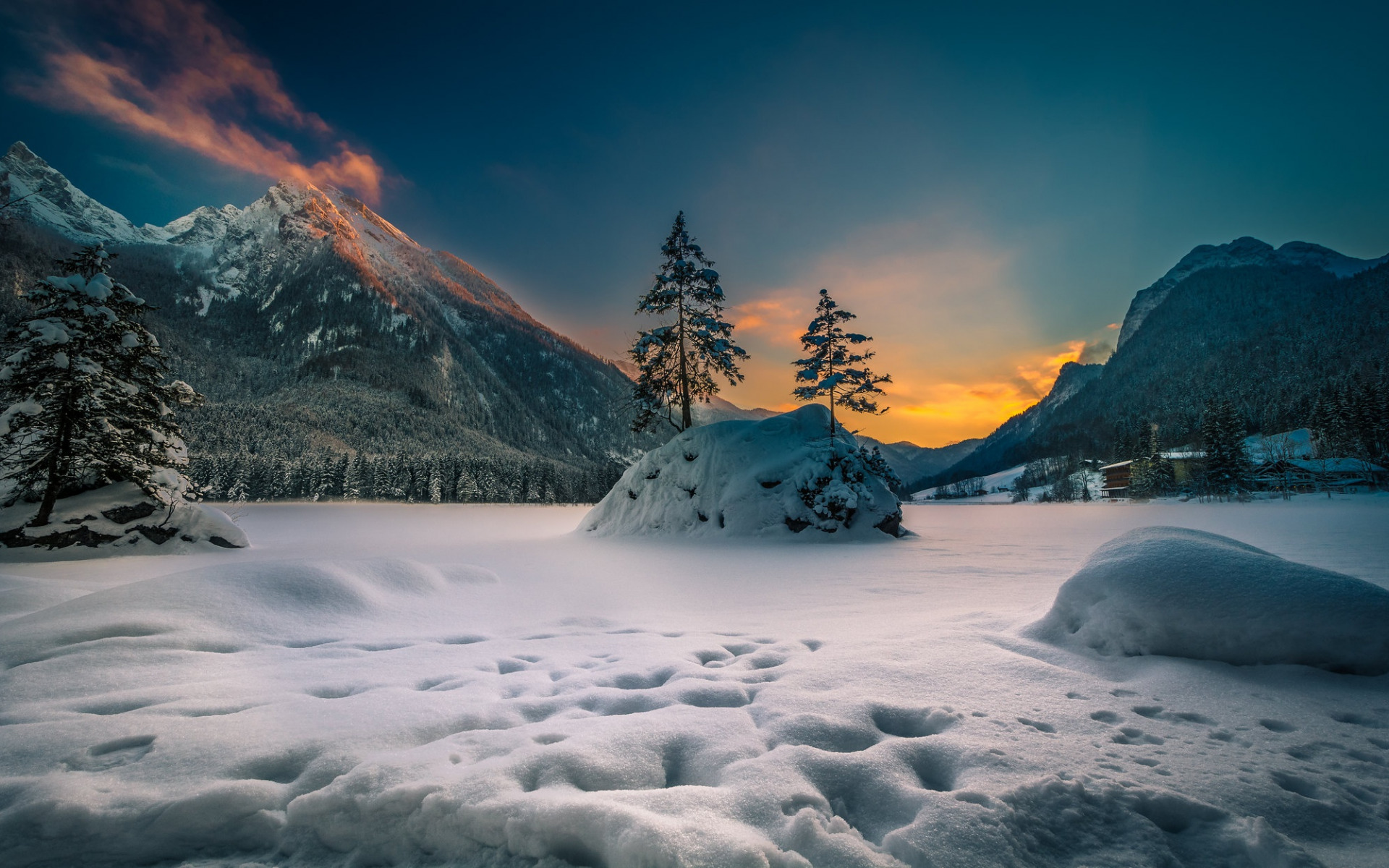 Description: A snowy landscape with a mountain range in the background at sunset with a red sky and clouds in the distance.