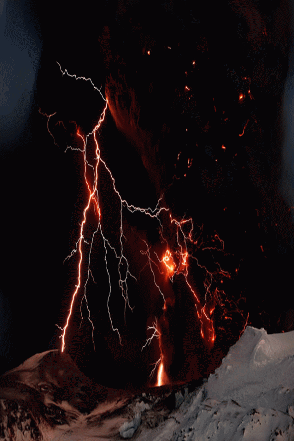 Description: A mountain covered in snow and lightning in the sky above it is a dark sky with a few clouds.