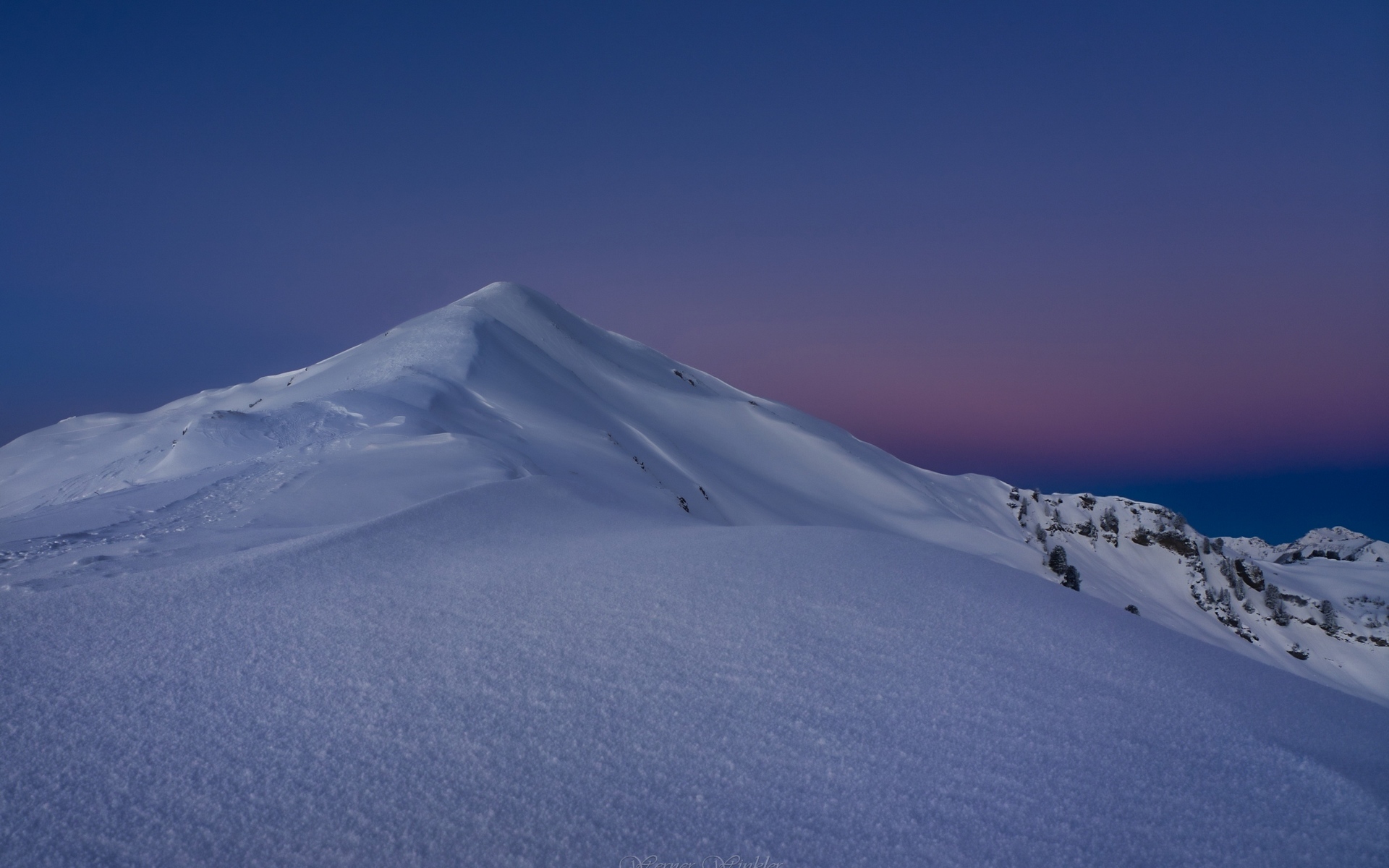 Description: A mountain covered in snow with a pink sky in the background at night time with a pink light in the sky.