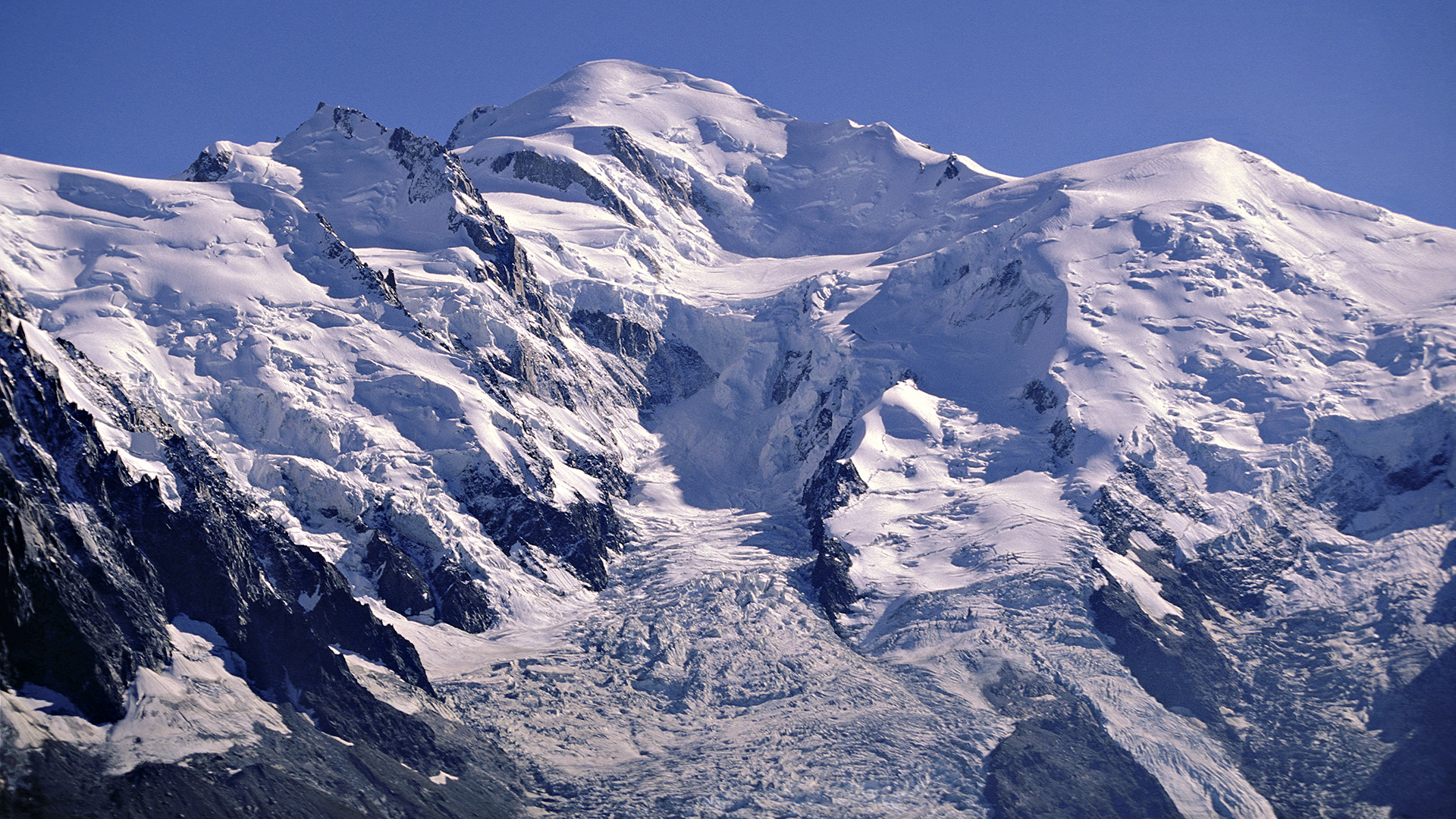 Description: A mountain covered in snow with a sky background and a plane flying by it's side in the air.