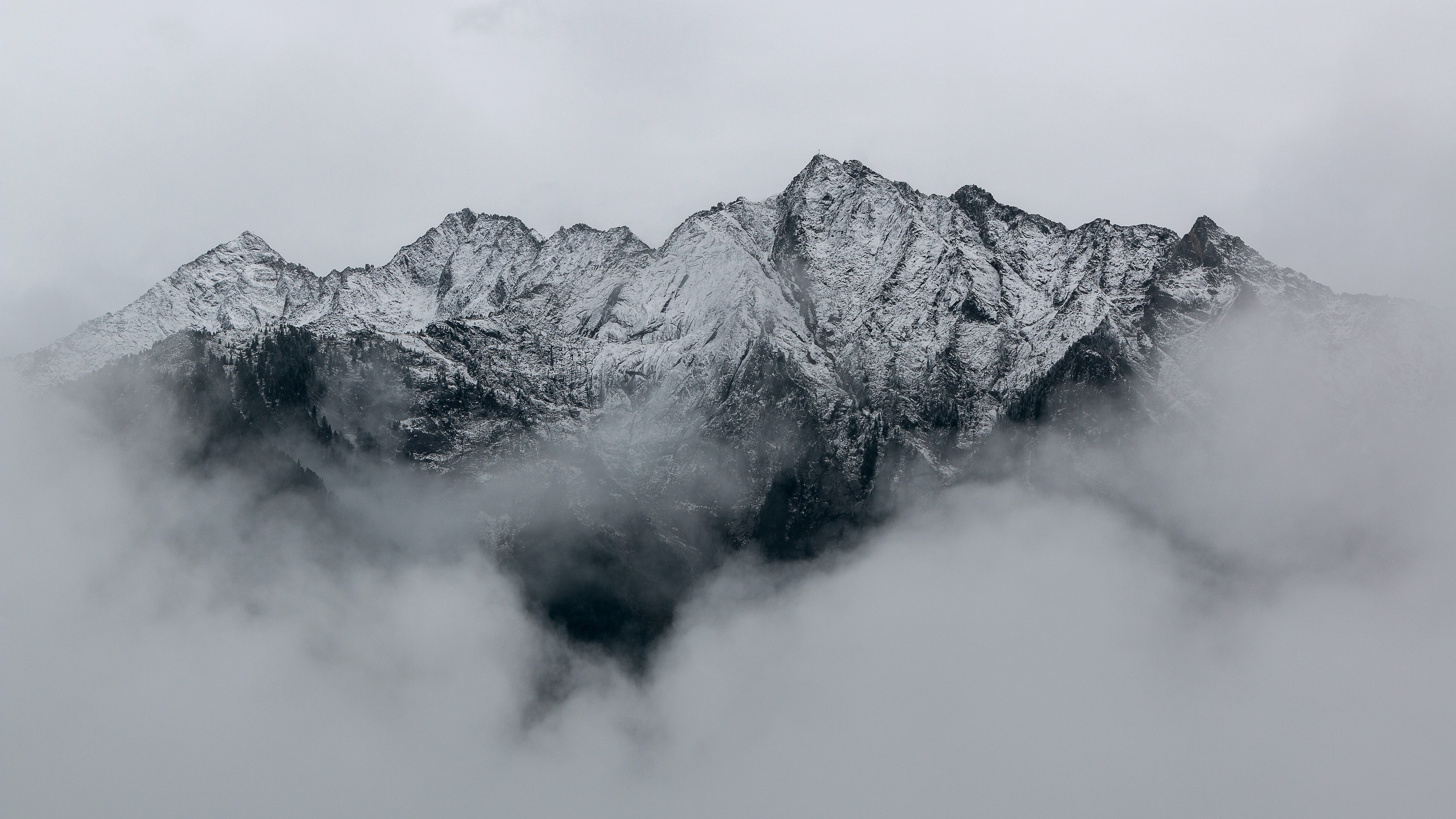 Description: A mountain range covered in snow and clouds in the distance is a cloud filled sky and a few clouds.
