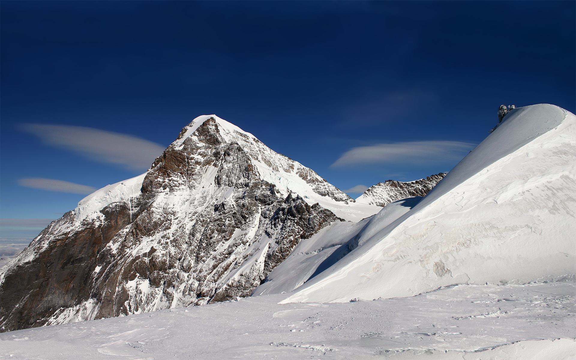Description: A snow covered mountain with a sky background and clouds in the sky above it.