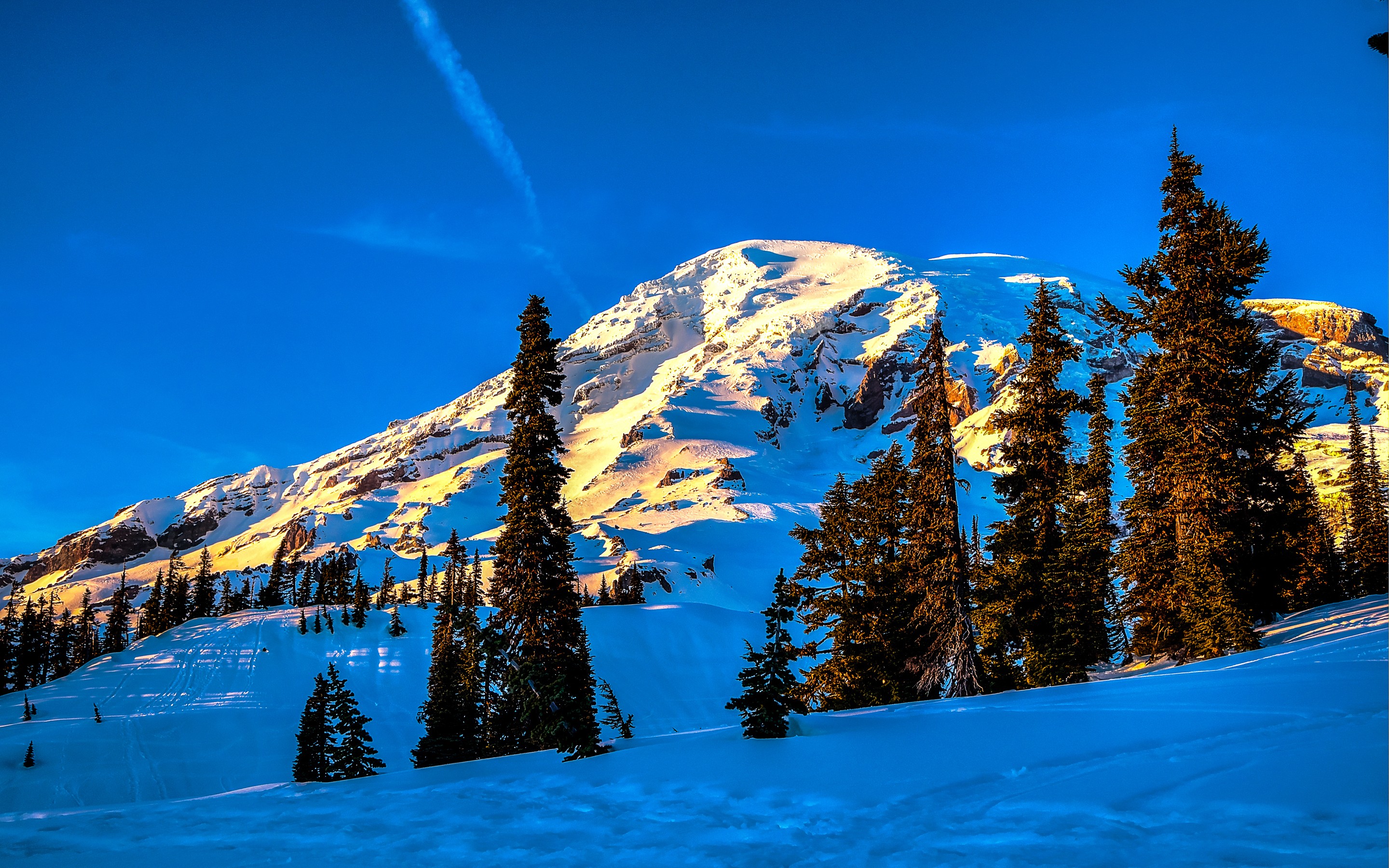 Description: A snow covered mountain with trees on the side of it and a blue sky above it with a few clouds.