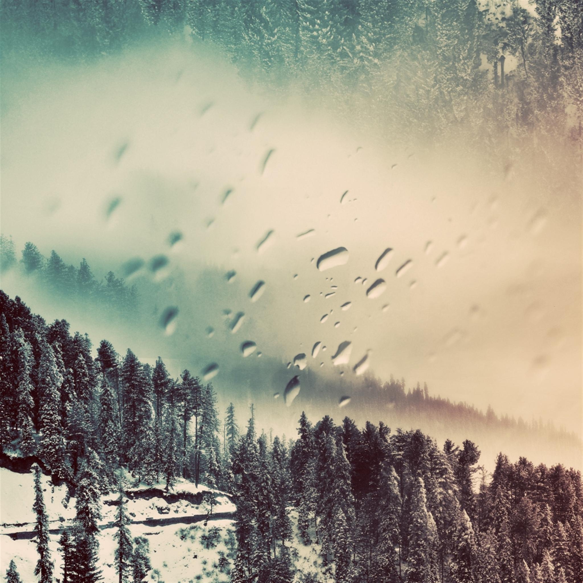Description: A picture of a snowy mountain with trees and rain drops on the window and a cloudy sky above it.