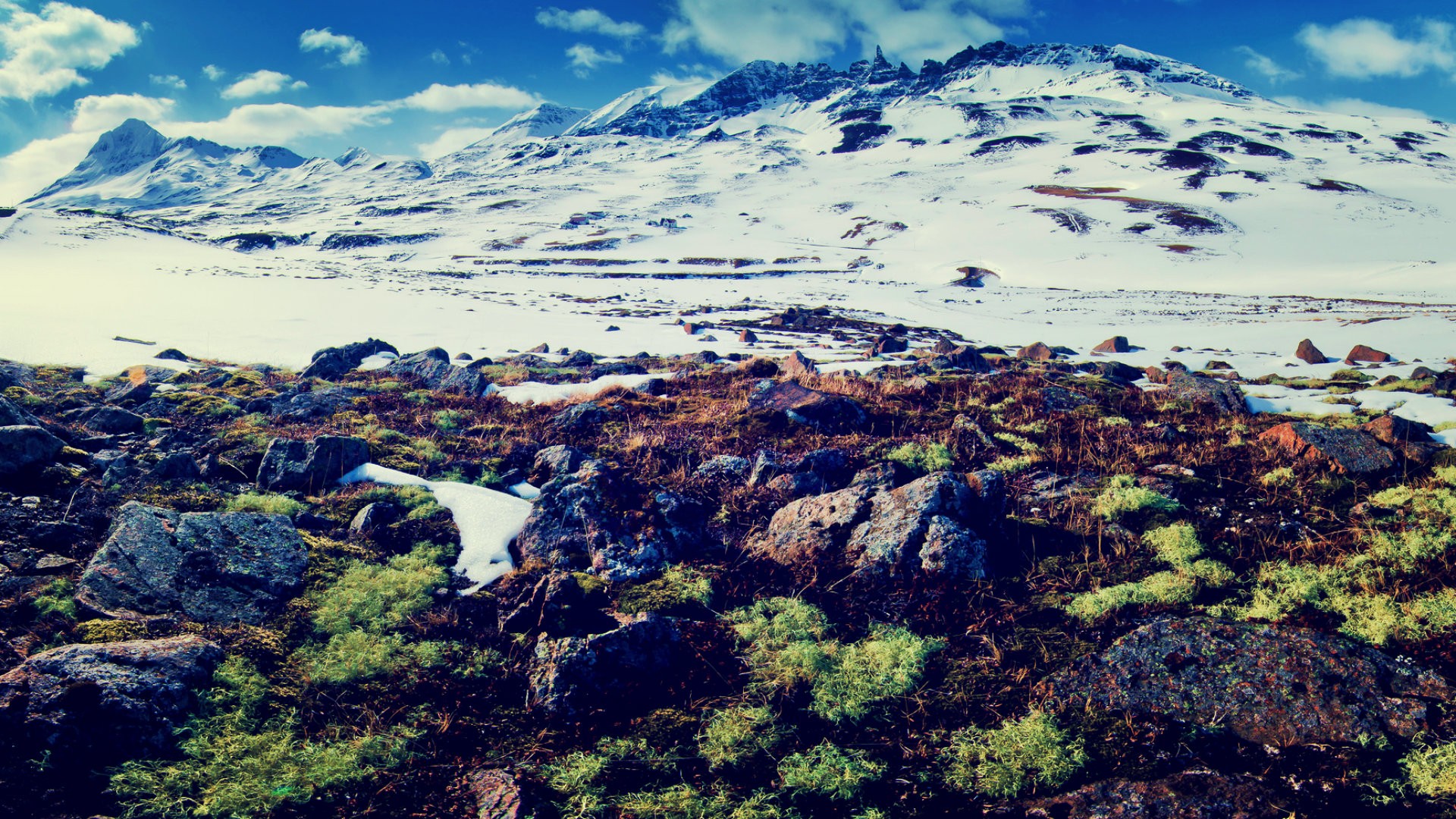 Description: A mountain covered in snow and grass with a sky background and clouds in the background with a few clouds.