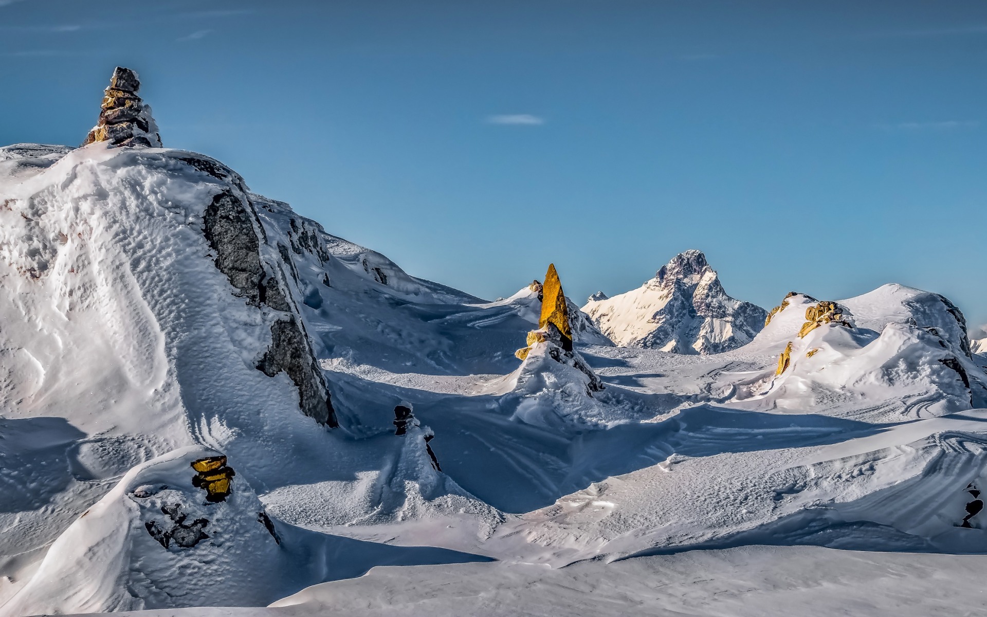Description: A mountain covered in snow with a yellow flag on top of it's peak and a few other mountains in the background.