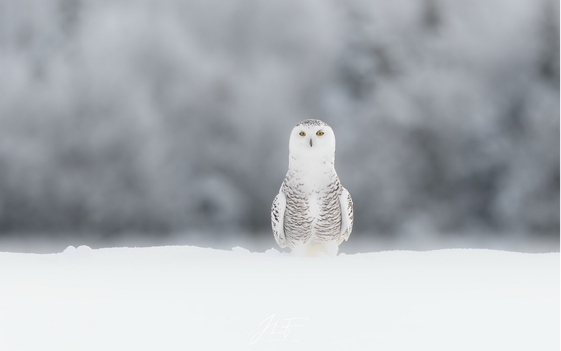 Description: A snowy owl is sitting in the snow looking at something in the distance with a blurry background of trees.