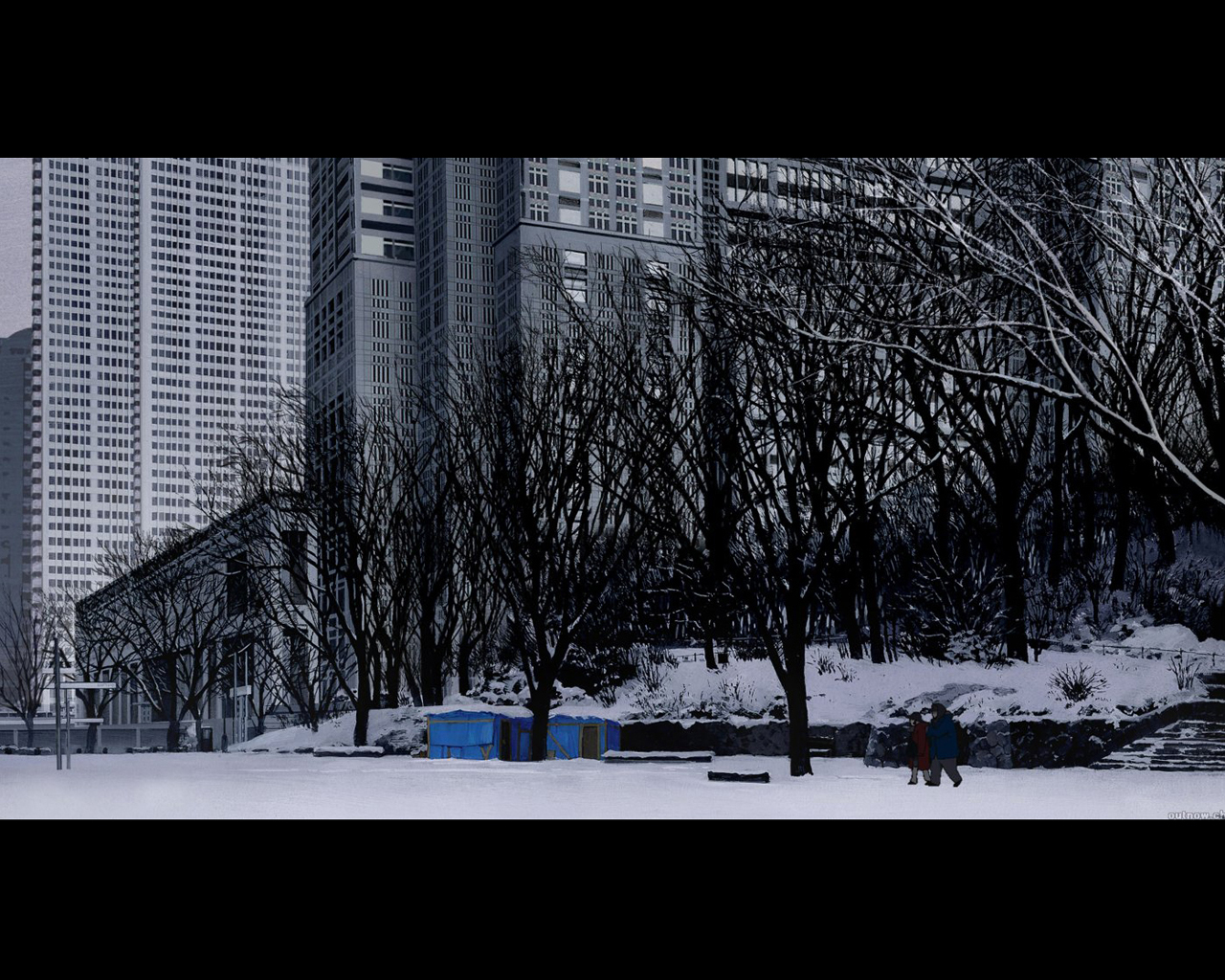 Description: A couple of people walking through a park in the snow with tall buildings in the background and a blue trash can in the foreground.