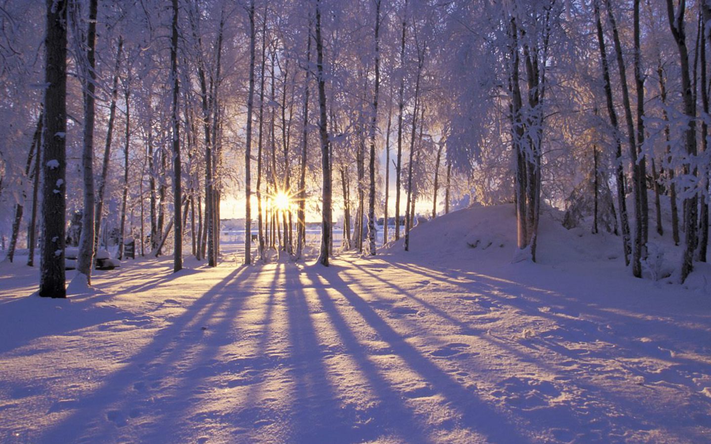 Description: A snowy path in a forest with the sun shining through the trees and the snow on the ground and the trees.