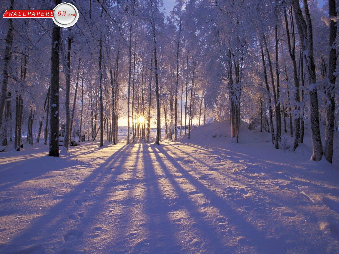 Description: A snowy path in a forest with the sun shining through the trees and the snow on the ground is almost white.